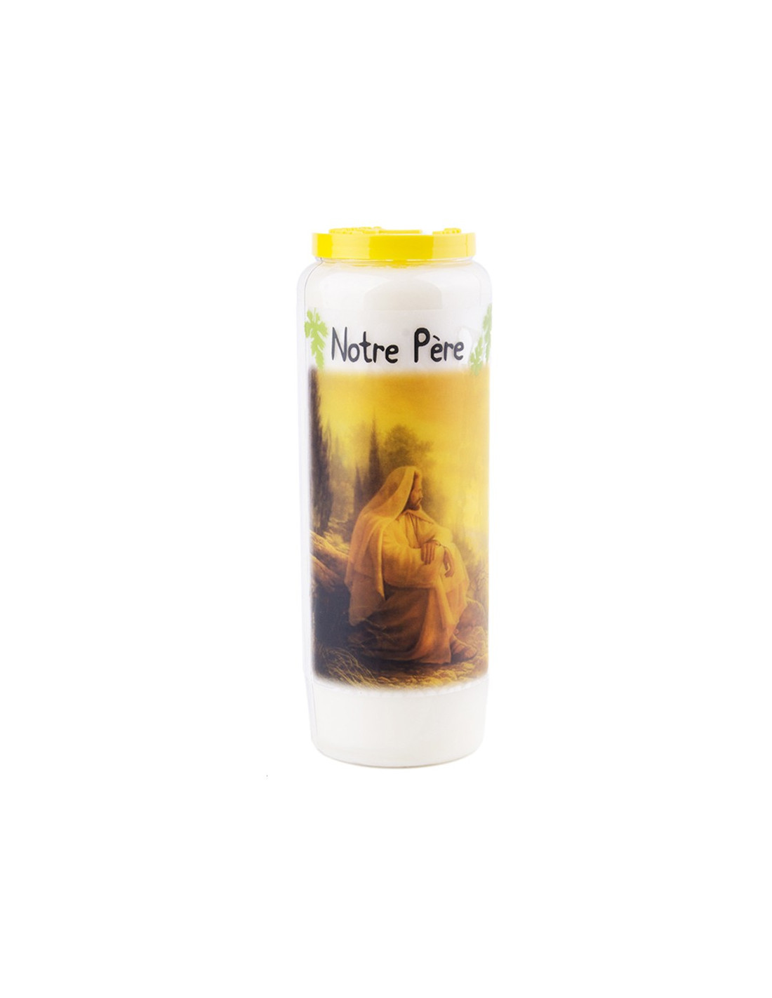 Bougie de neuvaine à l'image de Jésus Christ et prière du Notre Père au dos.
