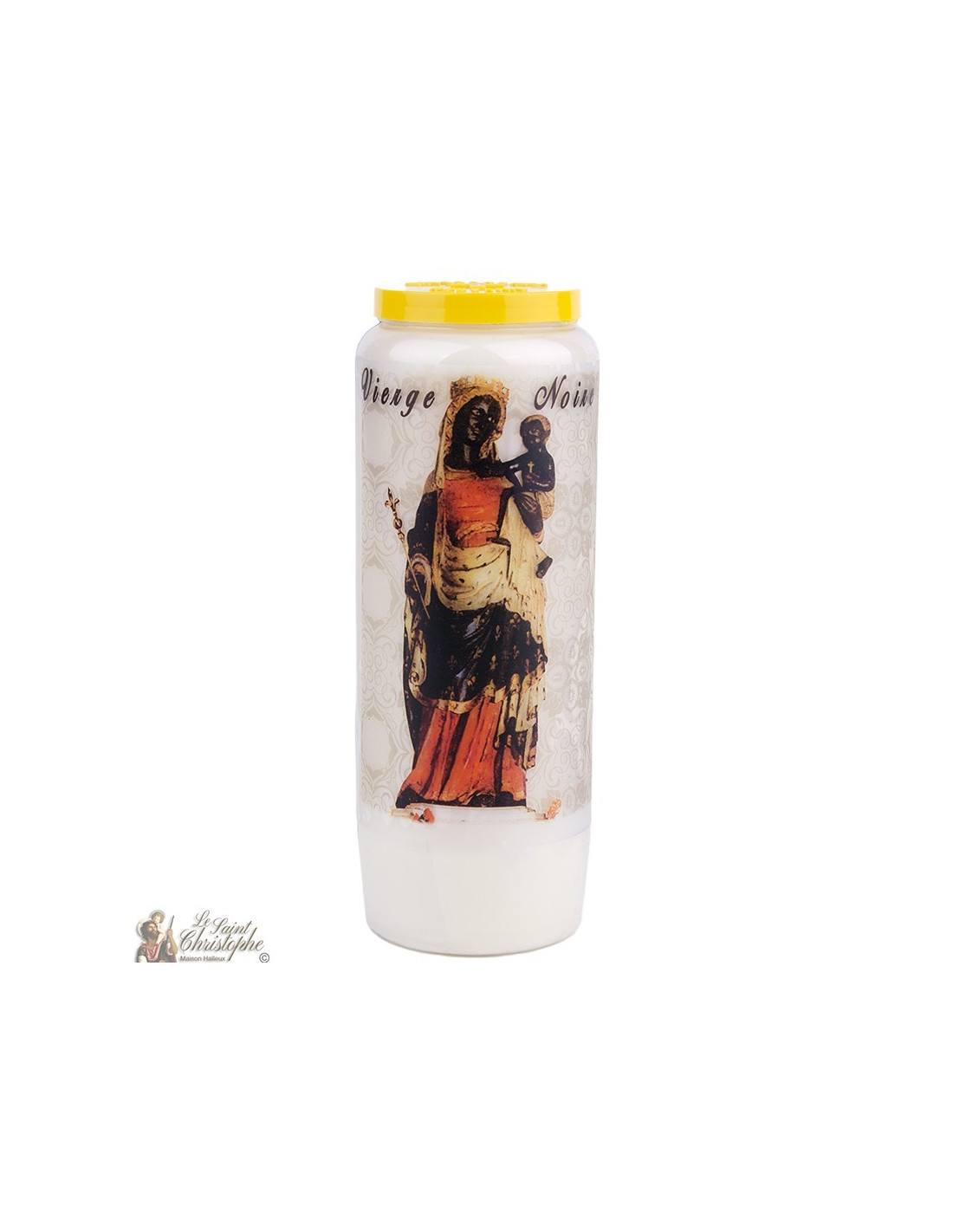 Bougie de neuvaine avec l'image de la Sainte Vierge Noire à l'avant et prière qui lui est dédiée au dos.