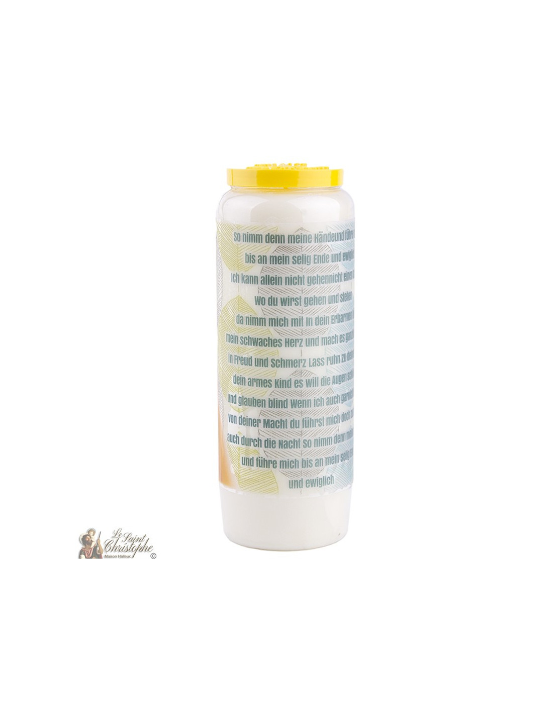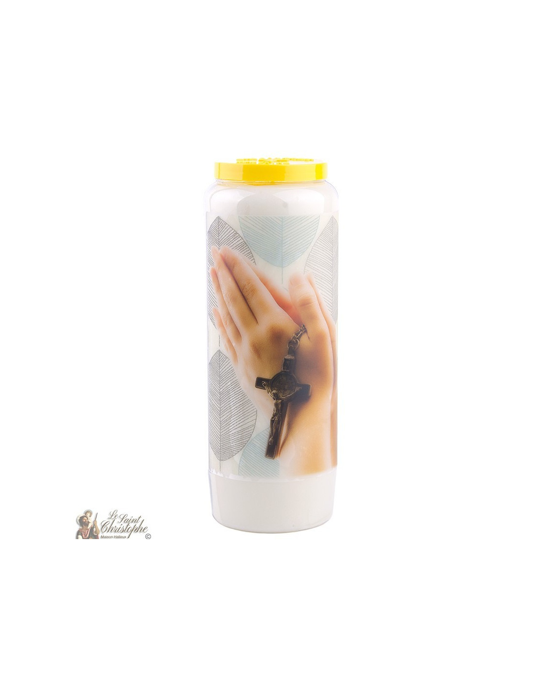 Bougie de neuvaine avec l'image de mains jointes pour la prière et prière au dos.