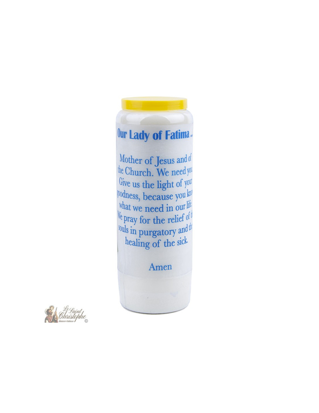 Bougie de neuvaine avec image de Sainte Fatima et prière qui lui est dédiée.