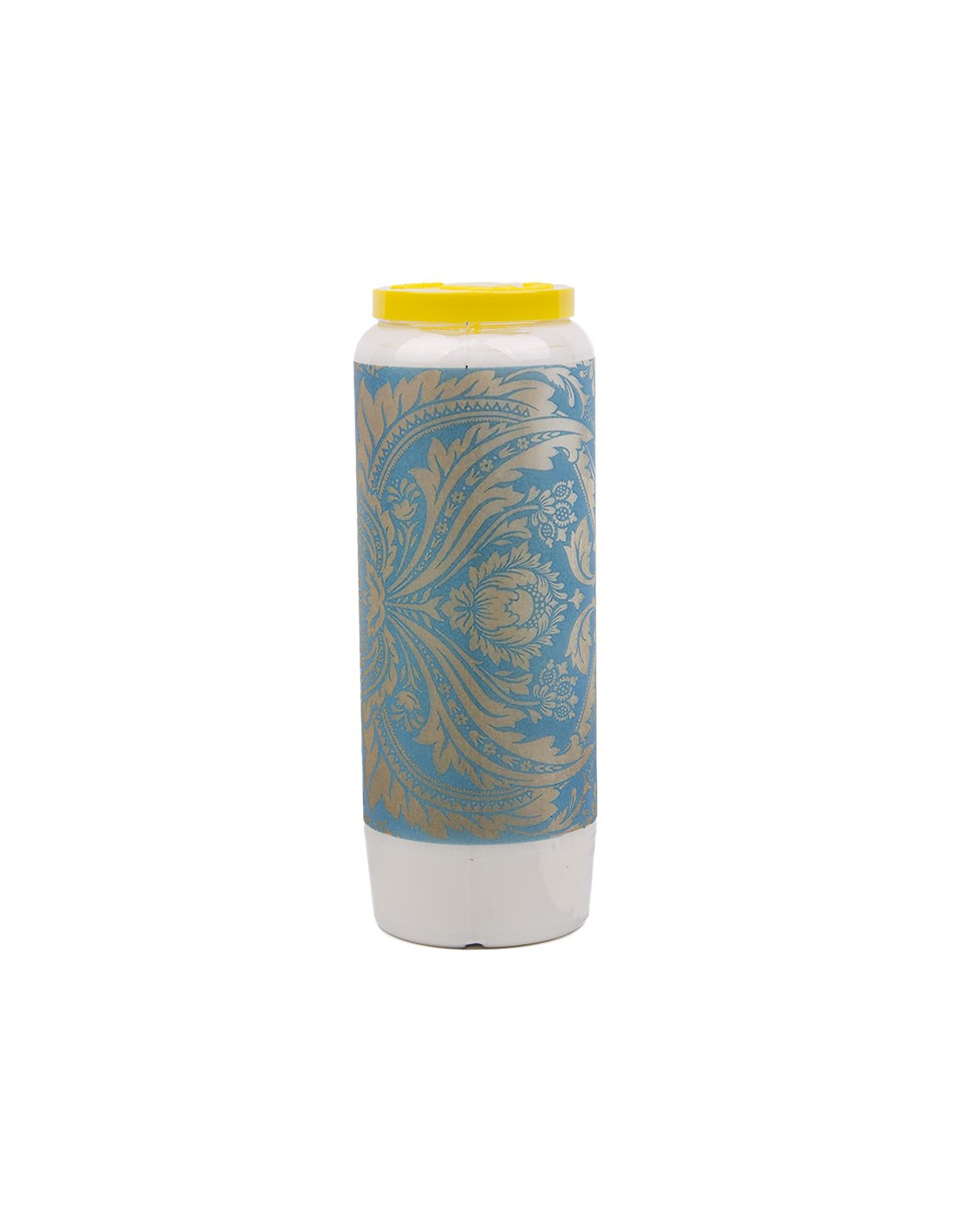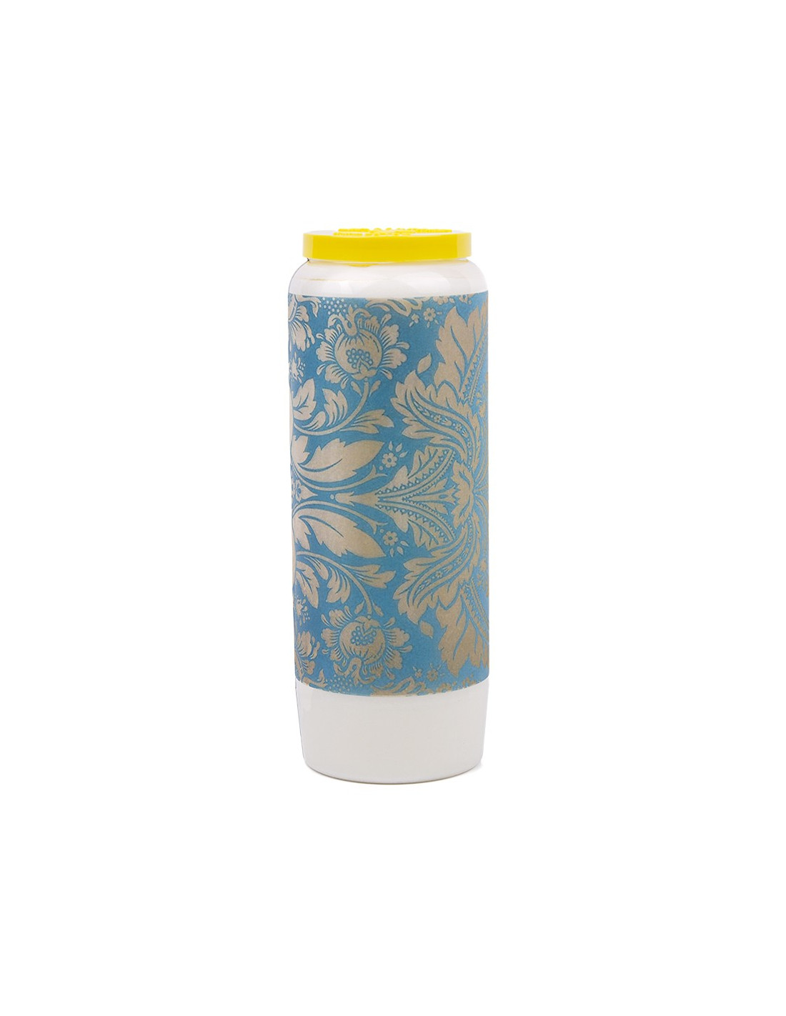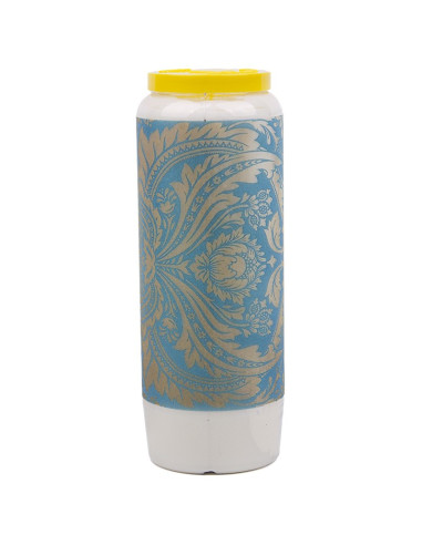 Bougie de neuvaine blanche ou colorée avec une image de tapisserie baroque bleu et jaune sur tout le pourtour de la bougie.