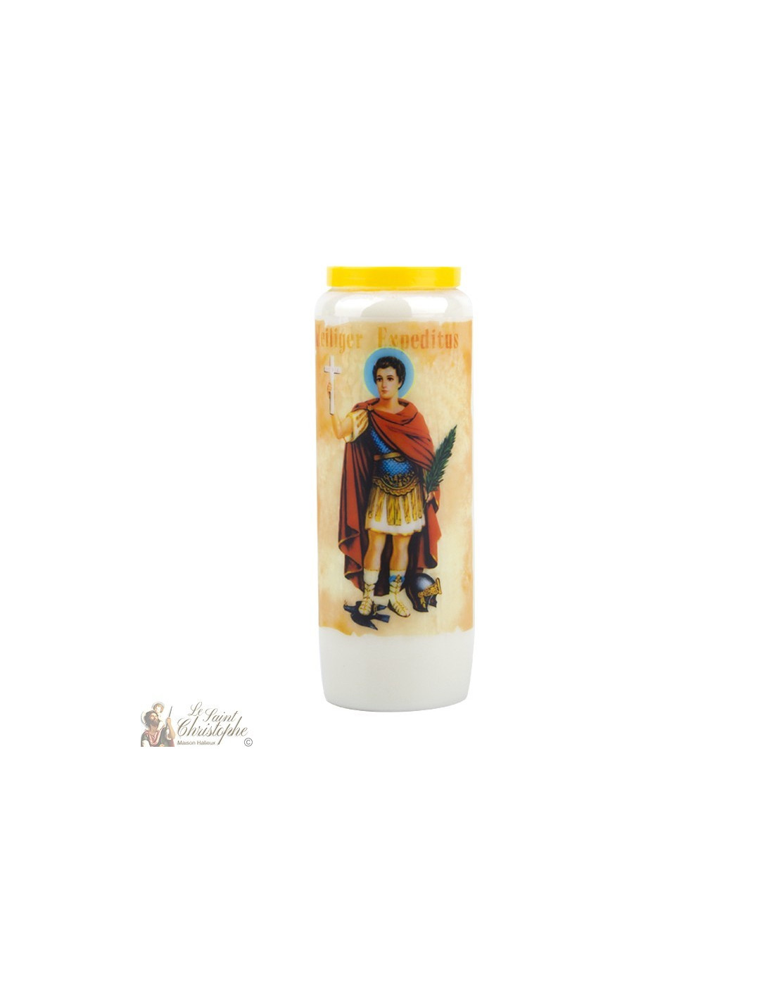 Bougie de neuvaine avec l'image de Saint Expedit à l'avant et prière qui lui est dédiée au dos.