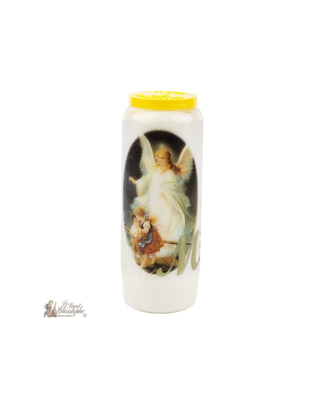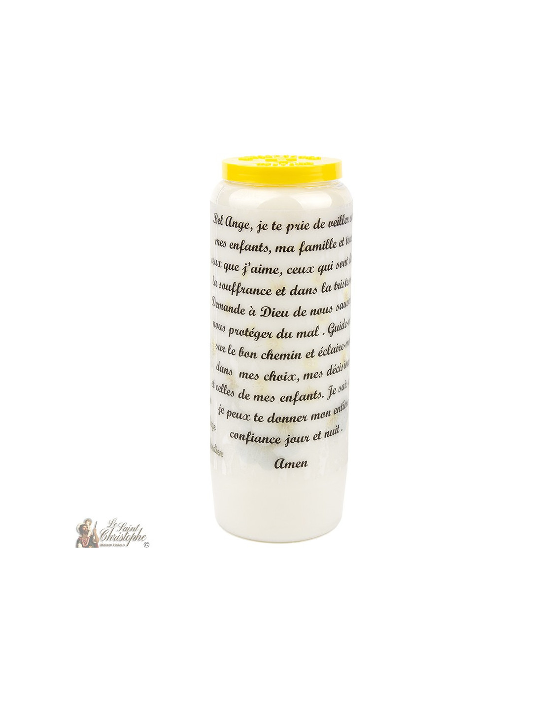 Bougie de neuvaine à l'image de l'Ange Gardien protégeant deux enfants et prière au dos.
