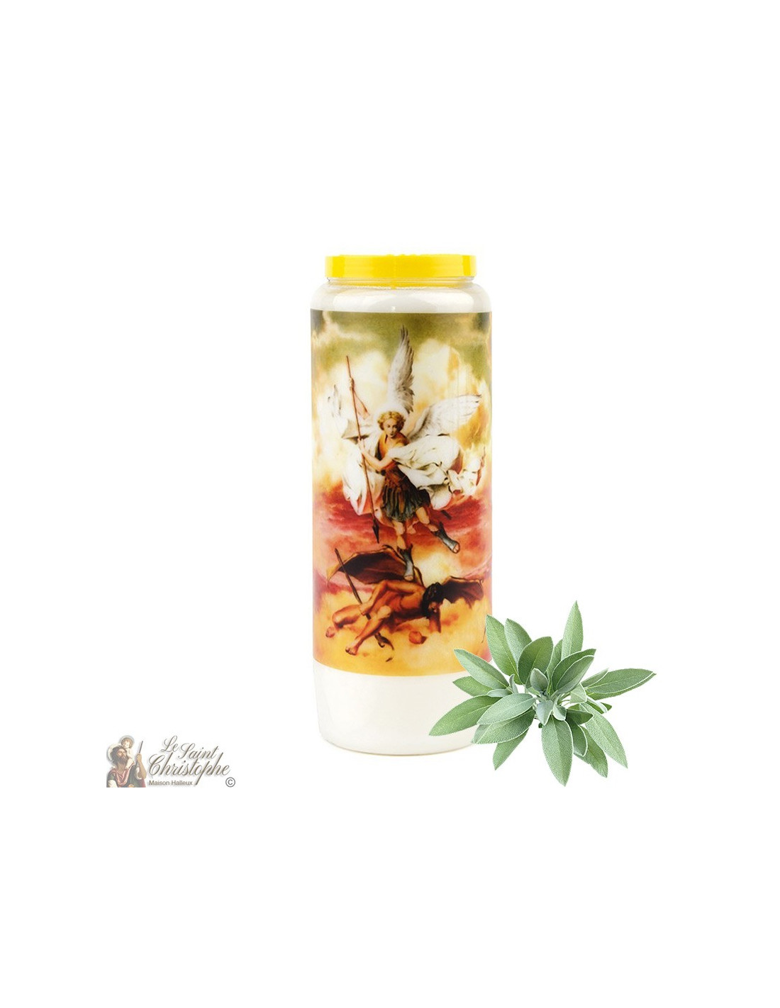Bougie de neuvaine végétale avec image de Saint Michel et parfumée à la sauge. Une combinaison parfaite pour une purification des lieux.