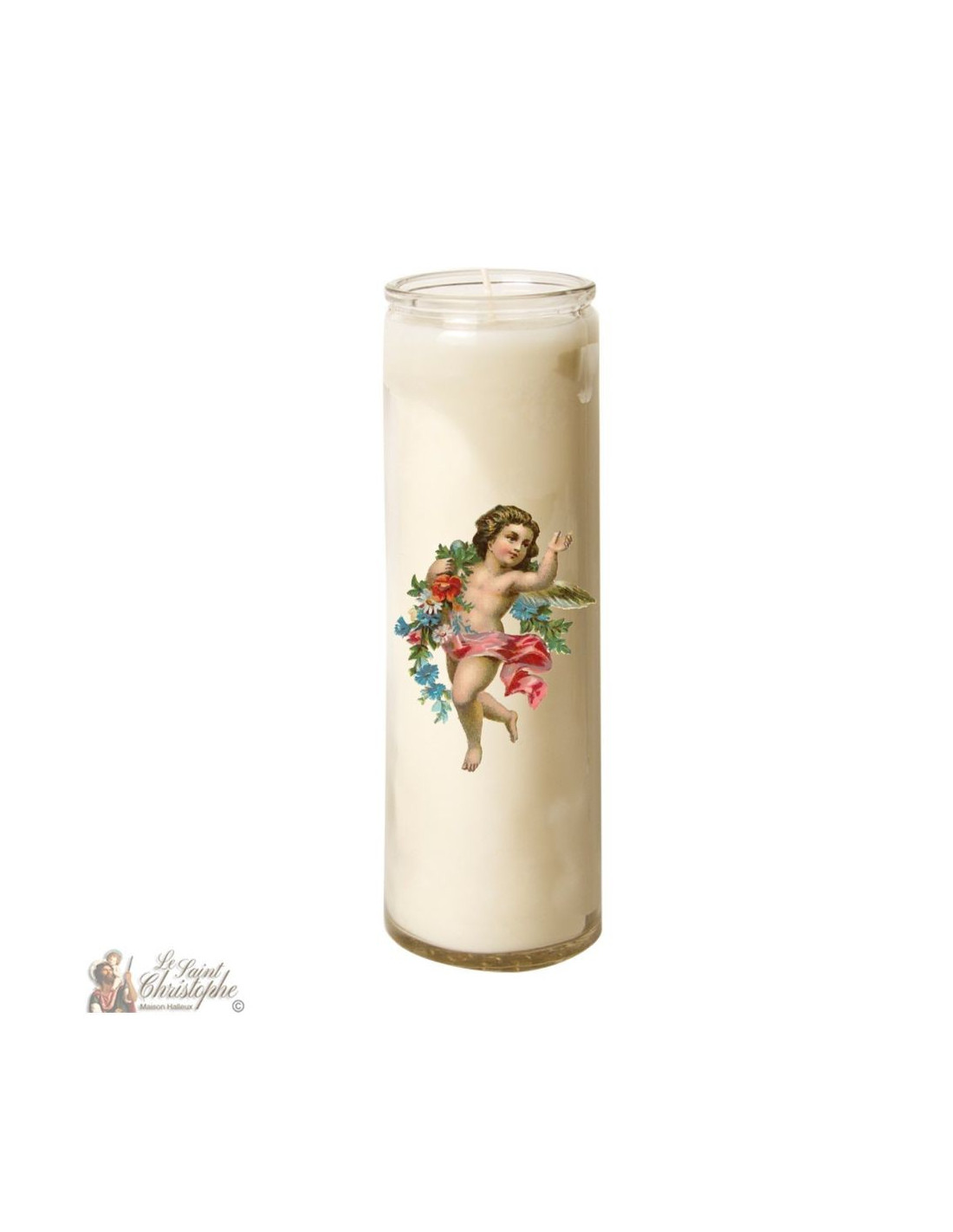 Avec l'image d'un chérubin portant des fleurs et dansant en décoration, cette bougie peut être utilisée pour la prière, la méditation, la décoration ou encore l'ésotérisme.
