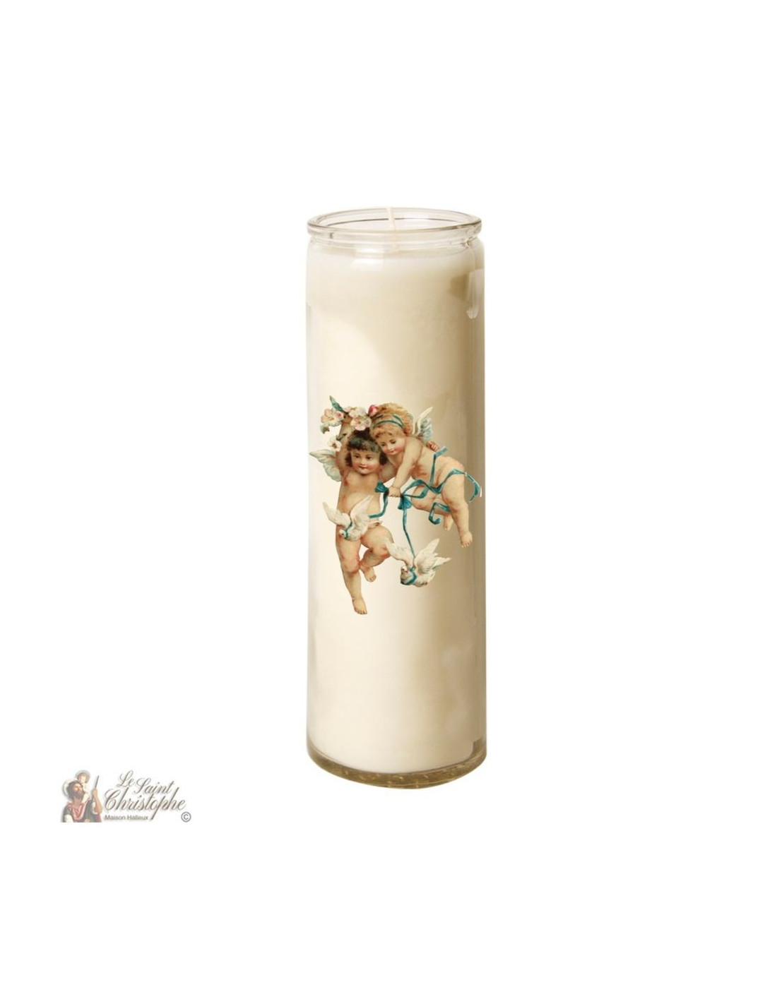Avec une belle image de petits angelots promenant des colombes en décoration, cette bougie peut être utilisée pour la prière, la méditation, la décoration ou encore l'ésotérisme.