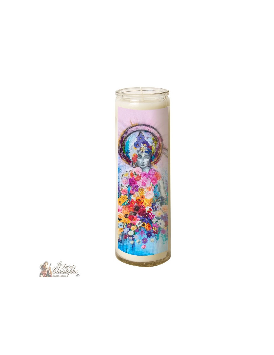 Avec l'image d'un bouddha en train de méditer et entouré de fleurs colorées en décoration, cette bougie peut être utilisée pour la prière, la méditation, la décoration ou encore l'ésotérisme.