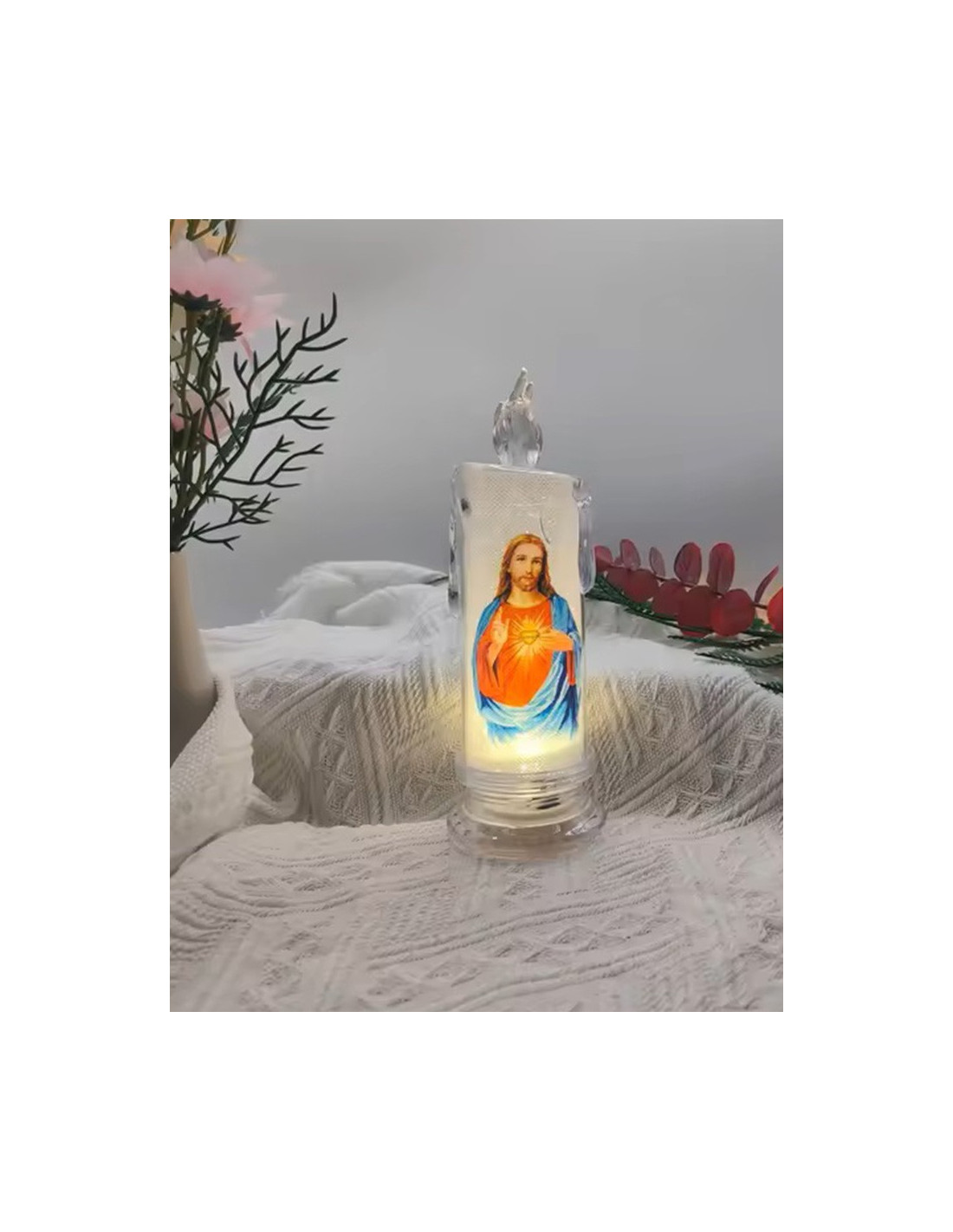 Bougie LED en plastique très joliment sculptée, avec image du Sacré Coeur de Jésus. L'intérieur de la bougie est couvert d'une texture pailletée qui donne un effet brillant en plus de la lumière LED.