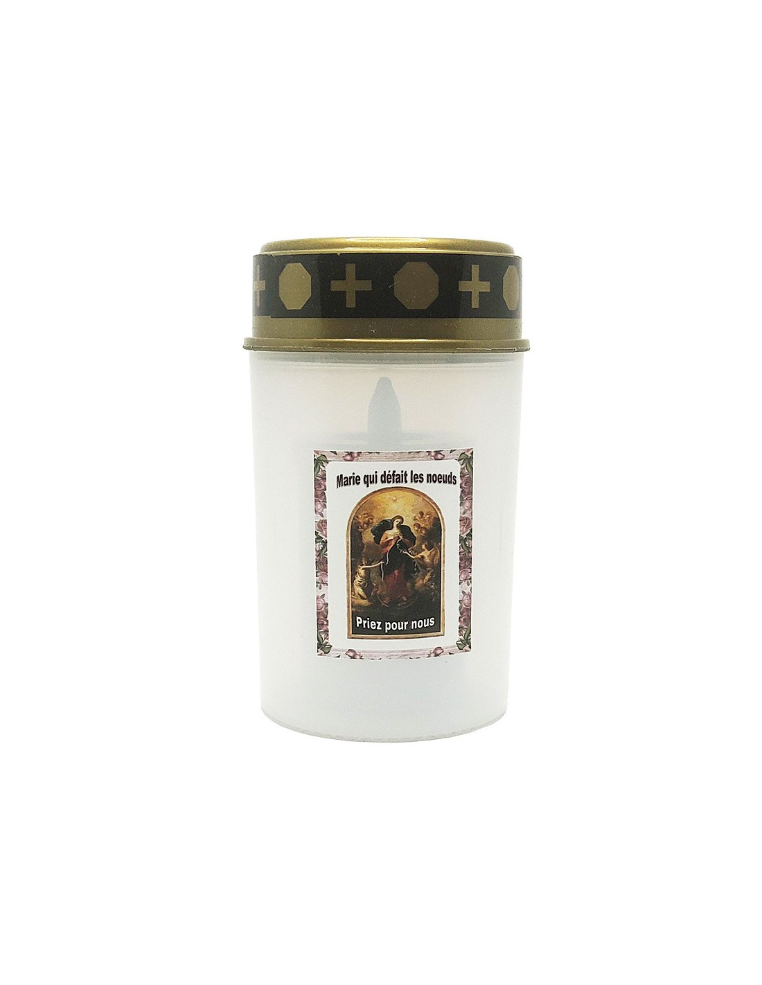 Cette bougie LED est décorée de l'image de Marie qui défait les nœuds. On prie cette représentation de la Sainte Vierge lorsque l'on est accablé par la vie, pour qu'elle nous aide à défaire les nœuds, à défaire les situations difficiles qui nous semblent inextricables.