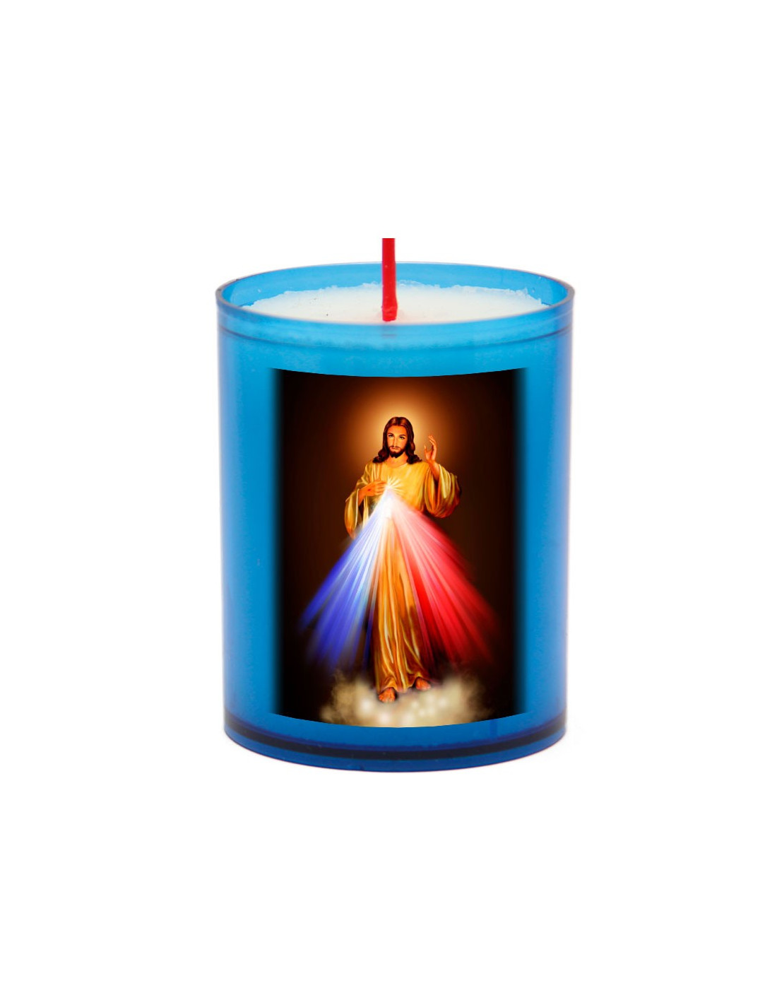 Bougies veilleuses bleues à l'image du Christ Miséricordieux. Vendues par 10 pièces.