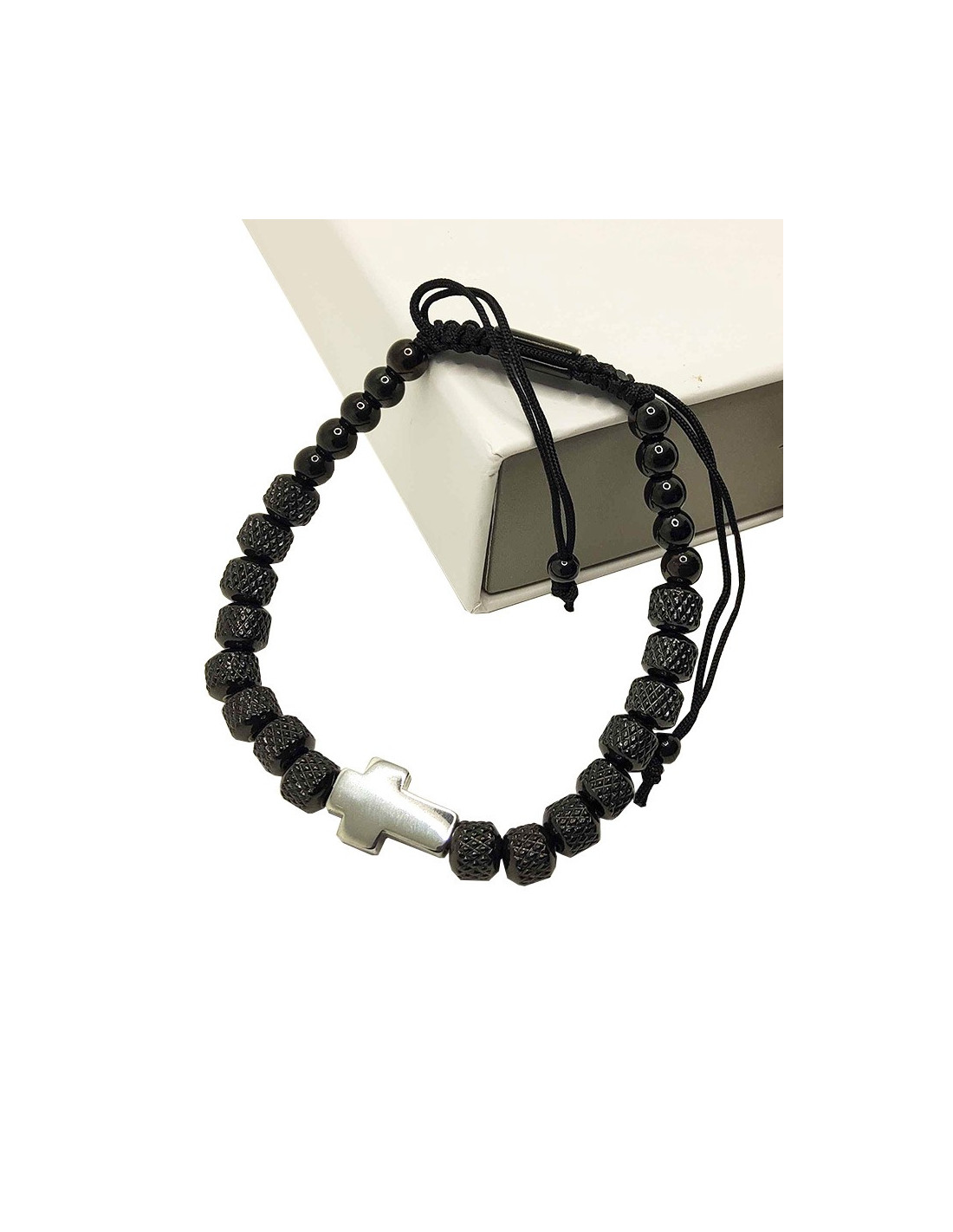 Bracelet avec croix argentée et perles noires en acier inoxydables montées sur cordon noir avec attache réglable en macramé.