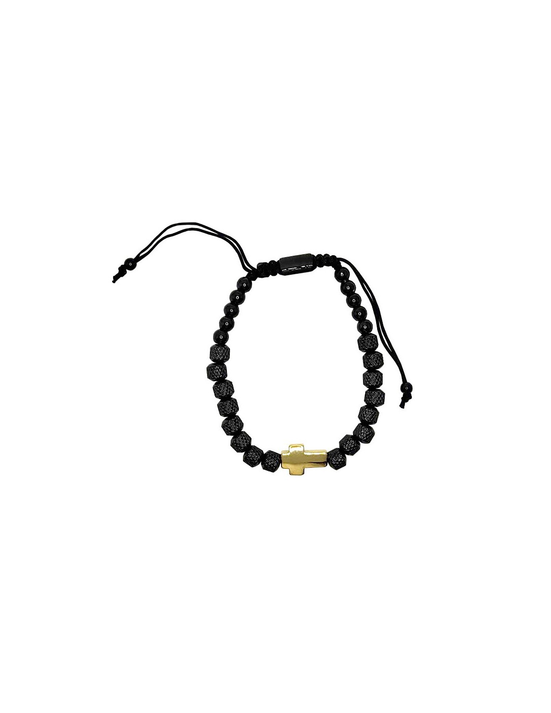 Bracelet avec croix dorée et perles noires en acier inoxydables montées sur cordon noir avec attache réglable en macramé.
