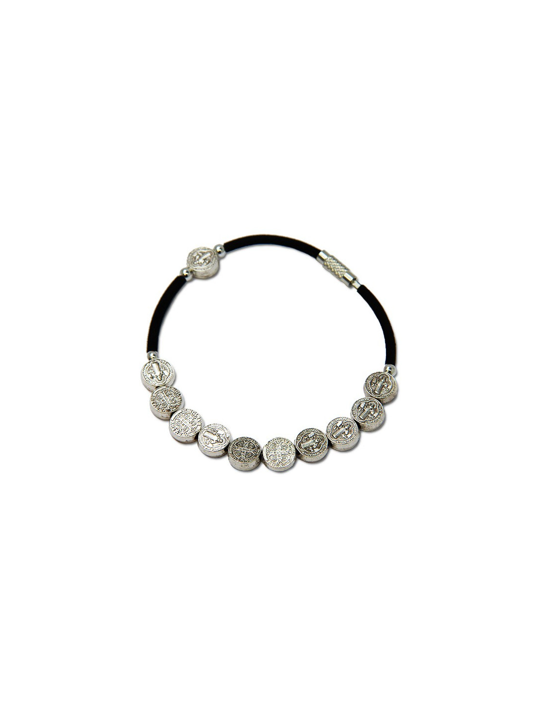 Ce bracelet à l'effet rock'n'roll est composé d'un cordon noir et de plusieurs perles en forme de médailles de Saint Benoît. Ce symbole est un signe de protection contre le mal et de bonne santé. Le nombre et la disposition des perles permettent de se servir du bijou comme d'une dizaine