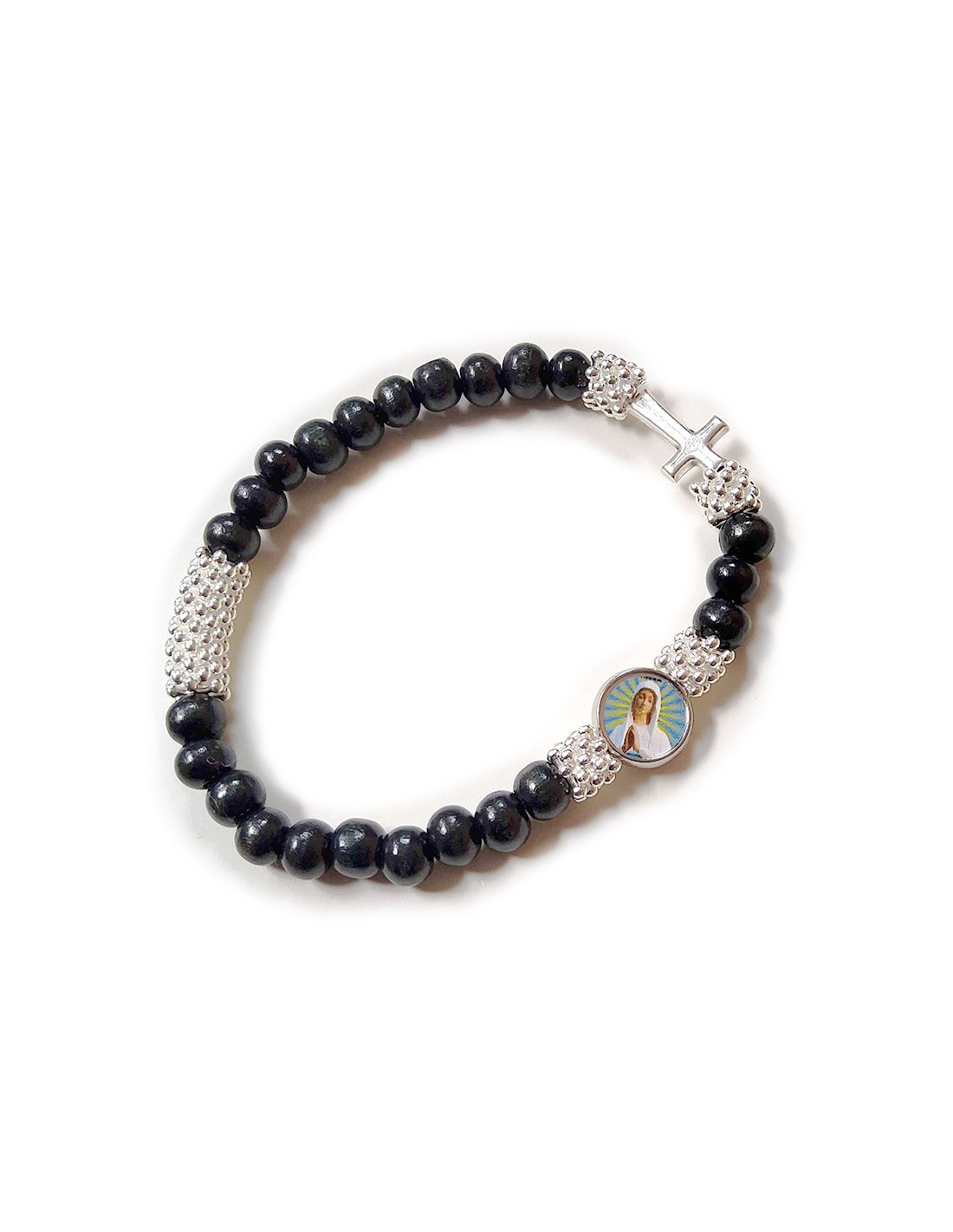 Bracelet élastique en bois et en perles argentées en plastique dont une petite croix, pouvant servir de dizaine de chapelet, aussi nommé dizainier, avec image de la Vierge de Banneux : Notre Dame des Pauvres. Les perles en bois sont teintées en noir.