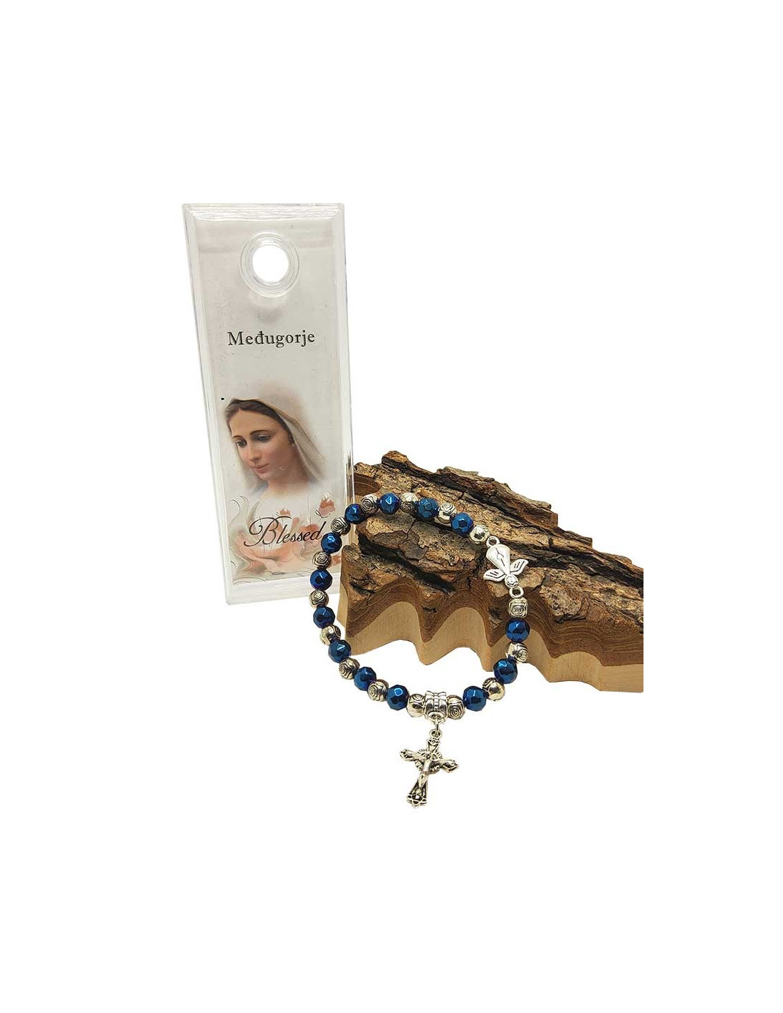 Ce bracelet élastique, aux perles bleues brillantes et argentées taillées en roses, est orné de deux petits charms (breloques) : un ange mignon décoré d'un cœur et une croix avec Jésus dessus. Protégé par un bel écrin transparent, le bracelet est accompagné d'une image de la Sainte Vierge de Medjugordjé. Le bracelet peut aussi servir de dizainier.