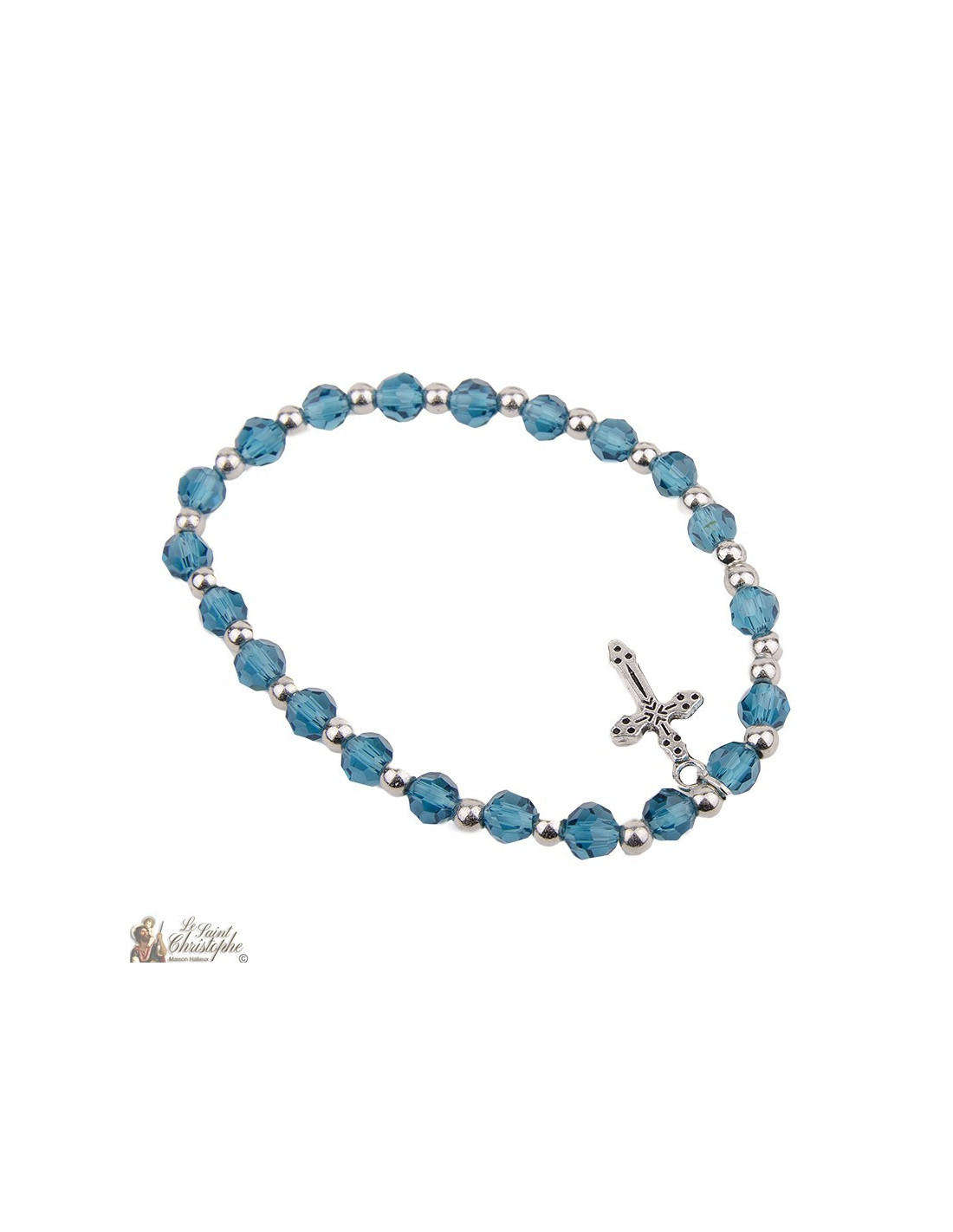 Bracelet avec perles en cristal au bleu clair céruléen et breloque croix. Le bracelet est composé d'un mélange avec les perles en cristal et des perles argentées. Elégant et brillant, il est doté d'une breloque en forme de croix avec une forme arrondie. Ce bracelet est monté à la main par notre atelier.