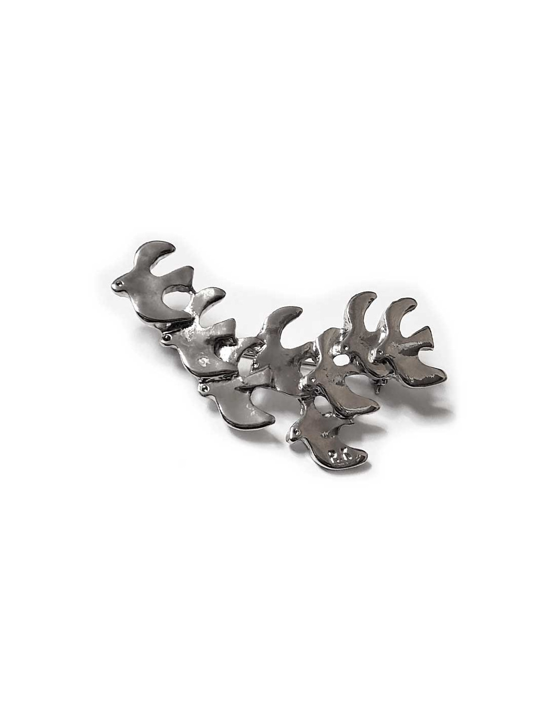 Cette broche en métal argenté représente un vol de colombes. Elles sont stylisées mais grâcieuses.