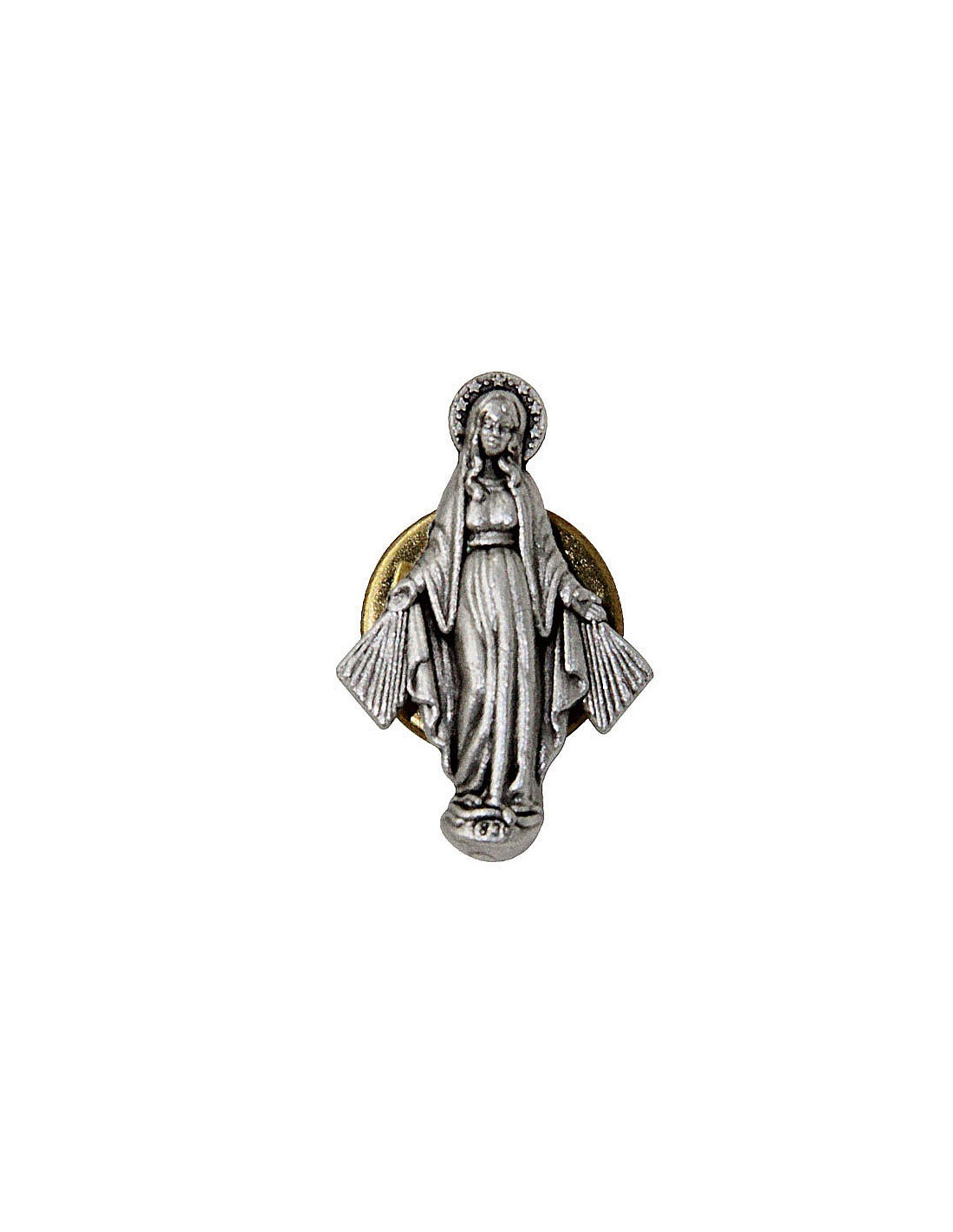 Pin's de la Vierge Miraculeuse en métal gris argenté. Cette broche fantaisie chrétienne est un symbole de la protection et de l'amour de la Sainte Vierge.