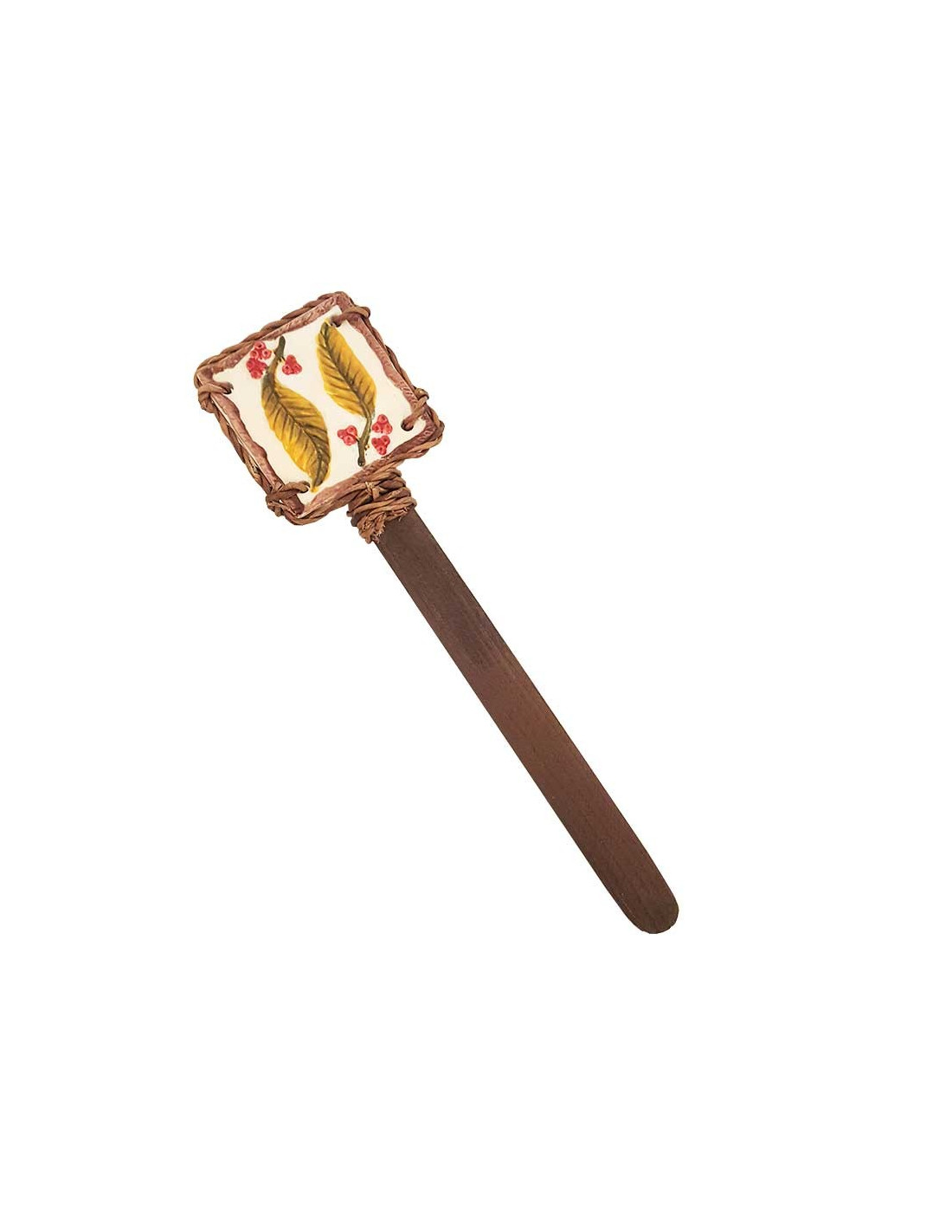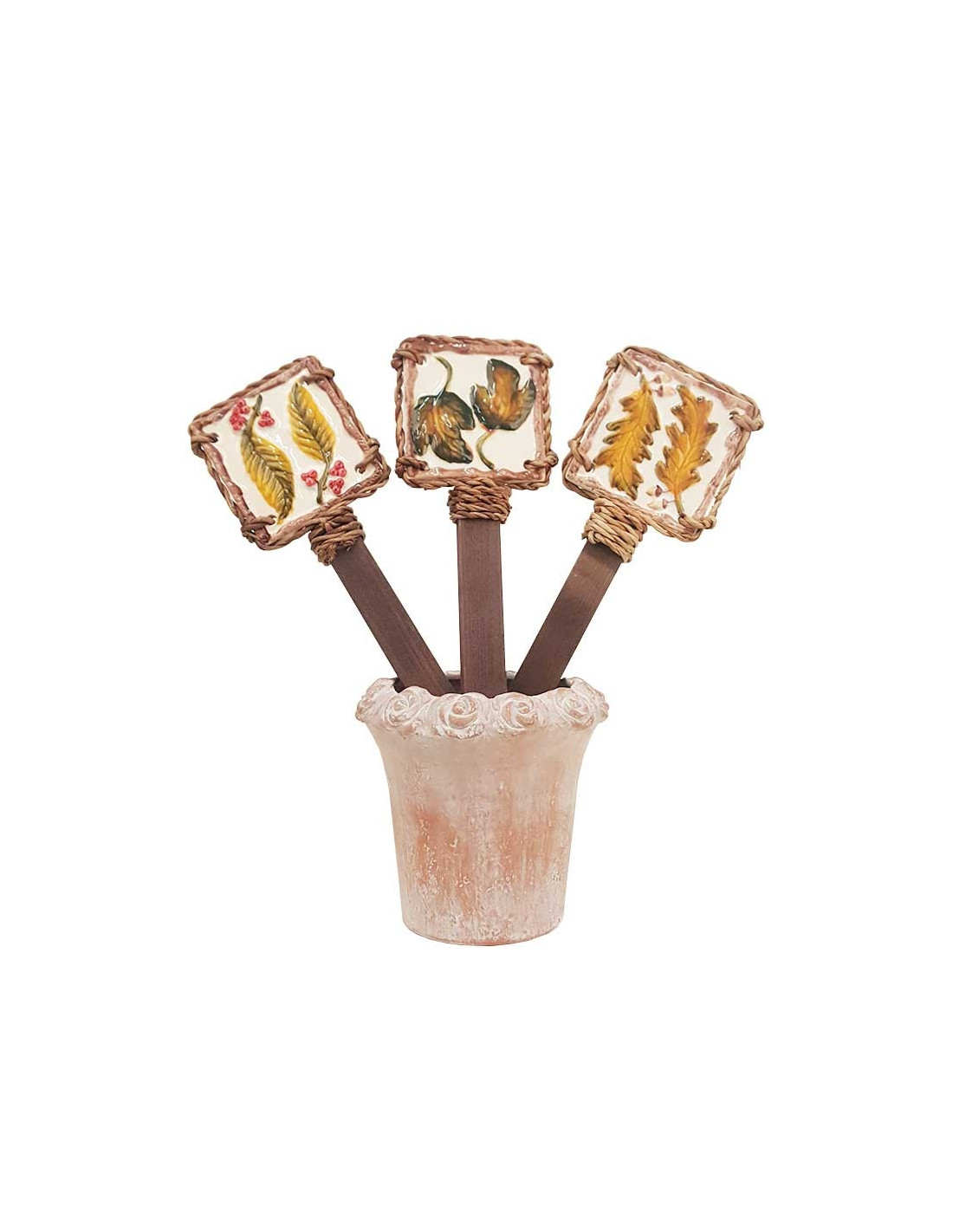 Bâton en bois décoratif avec plaquette en céramique peinte. La plaque est attachée au stick par de l'osier tressé qui donne à l'ensemble un charme rustique. Le décor de la céramique représente deux feuilles vert-or avec des baies roses. De quoi agrémenter les cache-pots et plantations en toute saison !