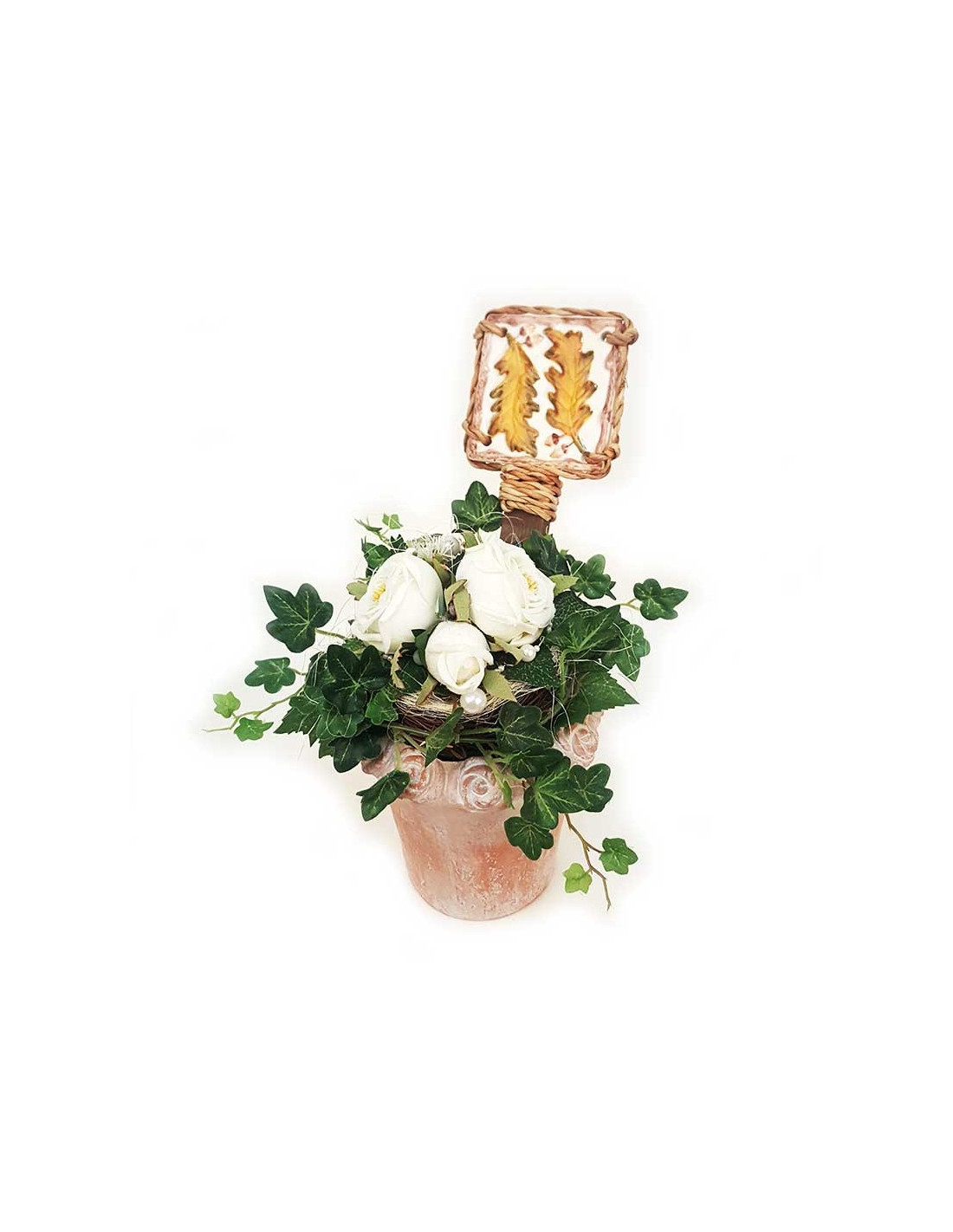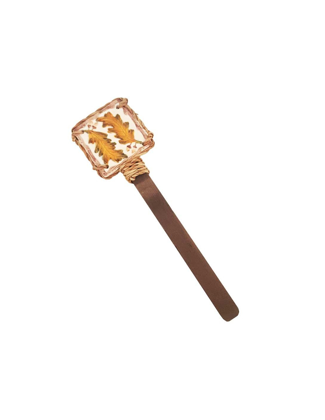 Bâton en bois décoratif avec plaquette en céramique peinte. La plaque est attachée au stick par de l'osier tressé qui donne à l'ensemble un charme rustique. Le décor de la céramique représente deux feuilles de chêne couleur or. De quoi agrémenter les cache-pots et parterres en toute saison !