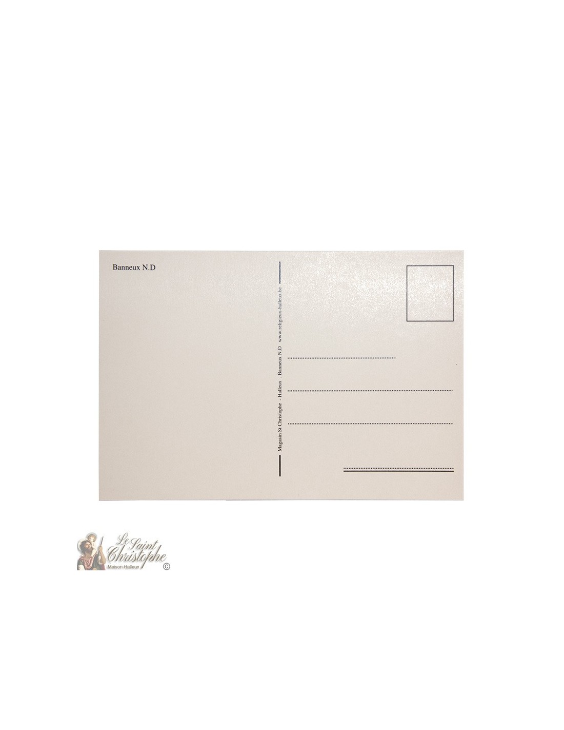 Carte postale cartonnée avec au recto une image holographique 2D. Selon l'angle dans lequel vous regardez la carte, vous voyez soit la Vierge des Pauvres, soit l'apparition de la Sainte Vierge Marie à la source de Banneux Notre-Dame avec la chapelle en fond.