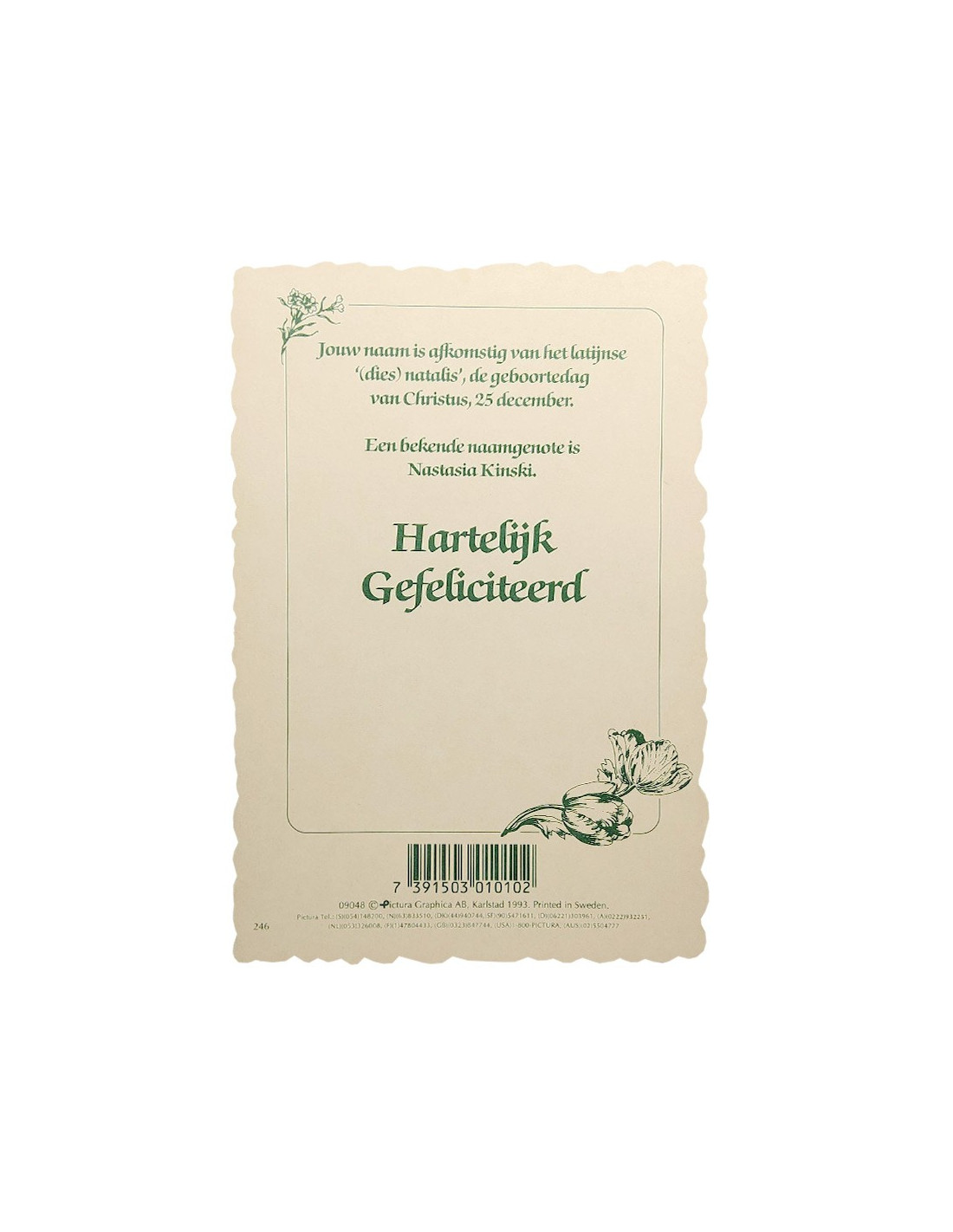 Cette carte postale personnalisée présente un prénom, sa signification étymologique et quelques figures connues qui le portent. Imprimée sur un carton de qualité avec une découpe élégante, elle est ornée d’un cadre floral coloré au style vintage. Parfaite pour une attention simple et originale lors d’un anniversaire, d’un baptême civil ou d’un petit mot symbolique. Une belle manière d’offrir un clin d’œil à l’identité d’un proche.