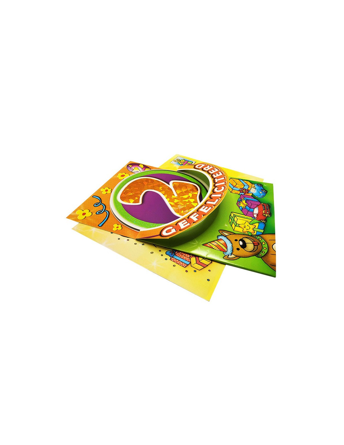 Célébrez les 2 ans d’un enfant avec une carte d’anniversaire colorée et festive ! Cette carte de vœux en néerlandais est décorée d’un grand chiffre holographique “2” étincelant, entouré de paillettes et de couleurs vives qui apportent instantanément une ambiance joyeuse. Le design enfantin met en scène un joyeux chien, des cadeaux colorés et des petites voitures, parfaits pour marquer cette étape spéciale de la petite enfance.