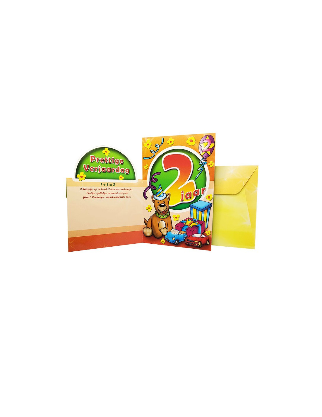 À l’intérieur, un texte pré-écrit en néerlandais souhaite un joyeux anniversaire de manière chaleureuse et amusante. Vous trouverez également un espace libre pour y ajouter vos propres mots doux ou souvenirs personnels, rendant la carte unique et précieuse pour l’enfant et sa famille.