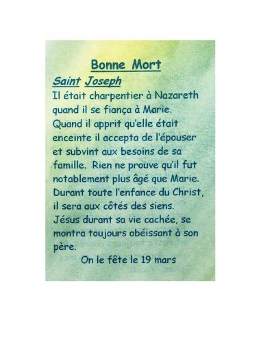 Cette carte est un petit outil discret pour prier vos saints patrons. Elle s'adresse aux personnes qui souhaitent une bonne mort ou le souhaitent pour leurs proches. La carte explique en quelques mots leurs saint patron : Saint Joseph. A l'arrière est écrite une courte prière dédiée à Jésus et par la grâce des saints patrons afin de réconforter dans l'effort, renforcer dans la foi, dépasser les obstacles et protéger des maux du quotidien.