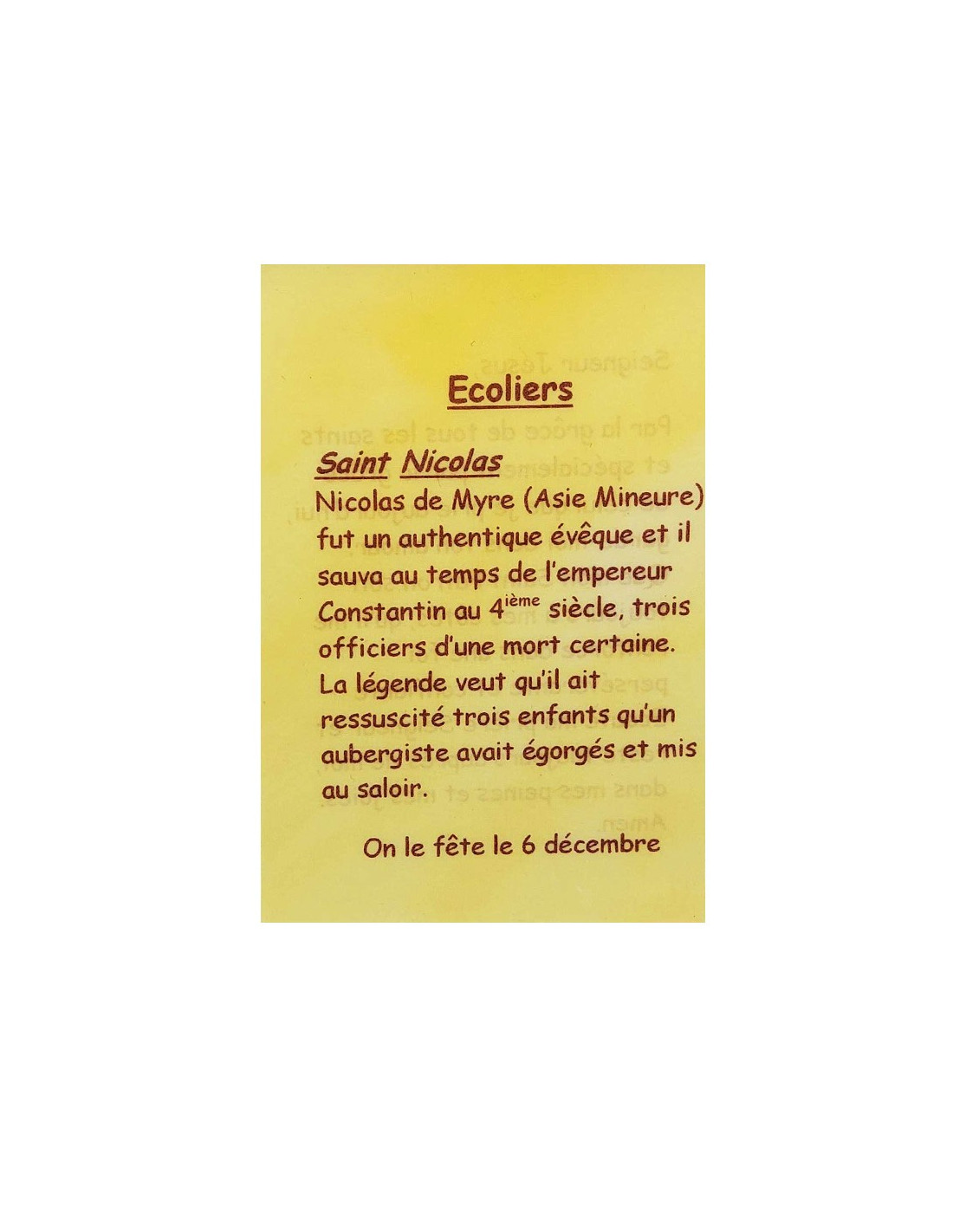 Cette carte est un petit outil discret pour prier vos saints patrons. Elle s'adresse aux écoliers et tout ce qui gravite autour et explique en quelques mots leurs saint patron : Saint Nicolas. A l'arrière est écrite une courte prière dédiée à Jésus et par la grâce des saints patrons afin de réconforter dans l'effort, renforcer dans la foi, dépasser les obstacles et protéger des maux du quotidien.