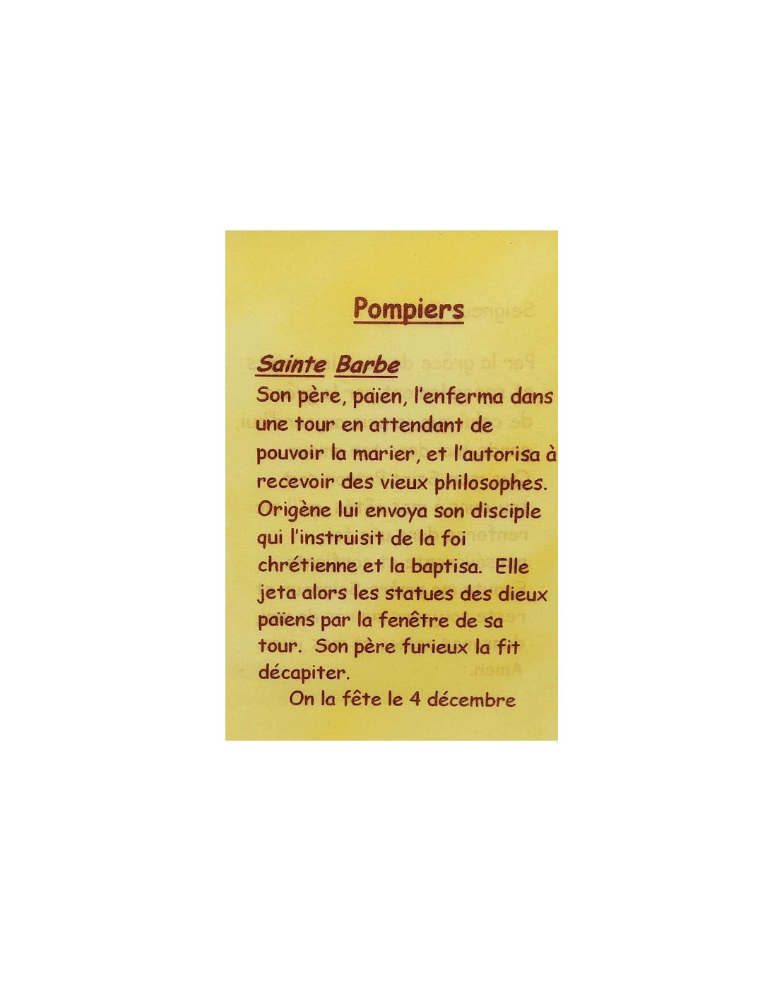 Cette carte est un petit outil discret pour prier vos saints patrons. Elle s'adresse aux pompiers et tout ce qui gravite autour et explique en quelques mots leurs saint patron : Sainte Barbe. A l'arrière est écrite une courte prière dédiée à Jésus et par la grâce des saints patrons afin de réconforter dans l'effort, renforcer dans la foi, dépasser les obstacles et protéger des maux du quotidien.