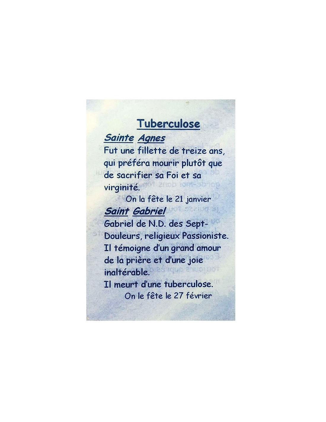 Cette carte est un petit outil discret pour prier vos saints patrons. Elle est utile pour la tuberculose, et explique en quelques mots les saints patrons qui aident à la soulager ou en guérir : Saint Agnès et Saint Gabriel. A l'arrière est écrite une courte prière dédiée à Jésus et par la grâce des saints patrons afin de réconforter dans l'effort, renforcer dans la foi, dépasser les obstacles et protéger des maux du quotidien.
