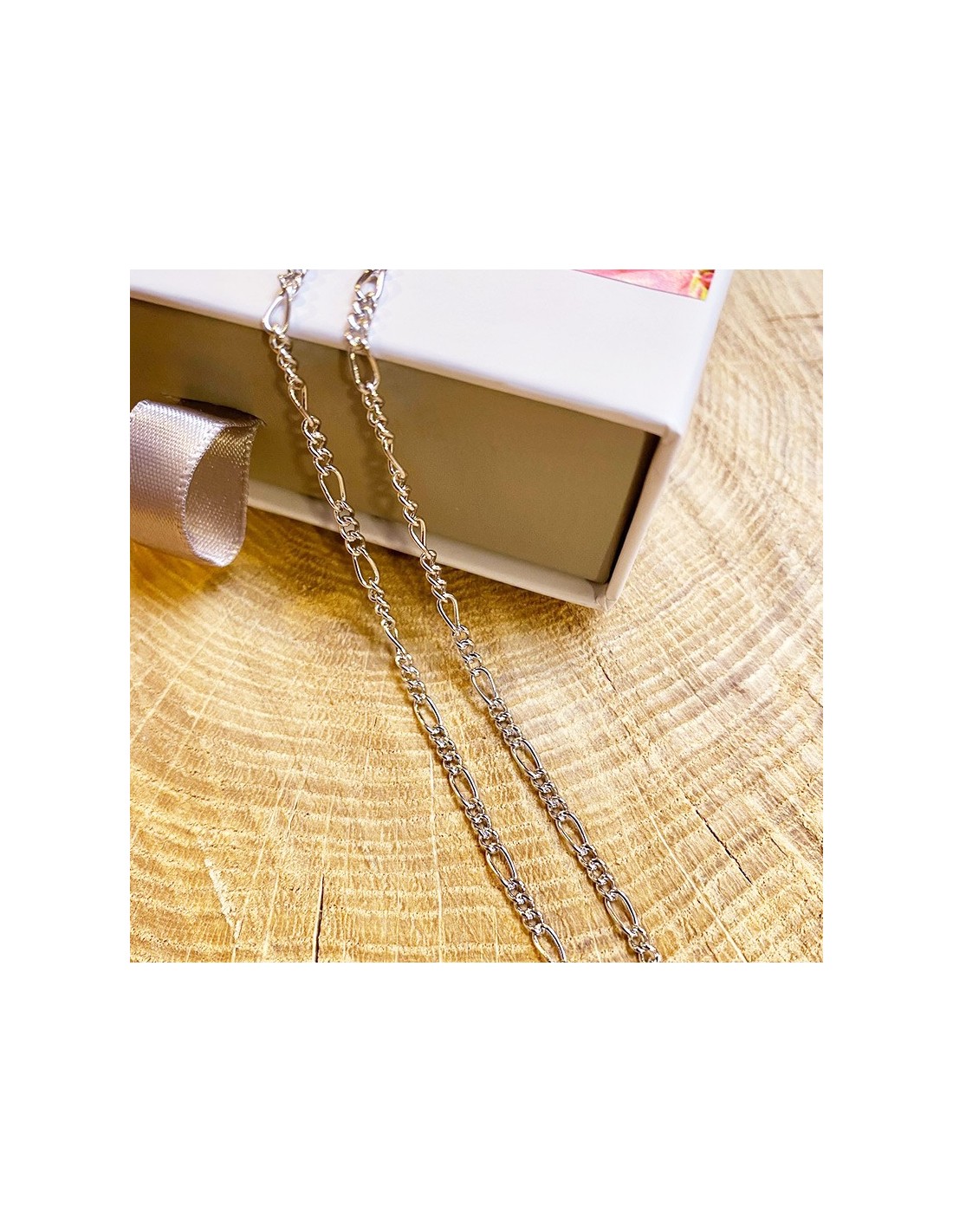 Chaîne Forçat Figaro de 50 cm en argent 925 rhodié, reconnaissable à ses maillons allongés et ronds qui se suivent dans un rythme d'un maillon Figaro pour trois Forçats. Très confortable, cette chaîne est sophistiquée et chic, se portant seule ou se mariant harmonieusement avec un pendentif.