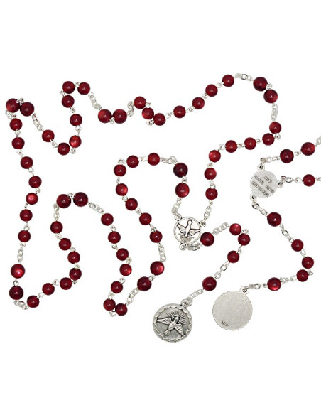 chapelet perles plastiques rouges montées sur chaîne en métal argenté