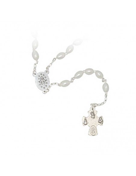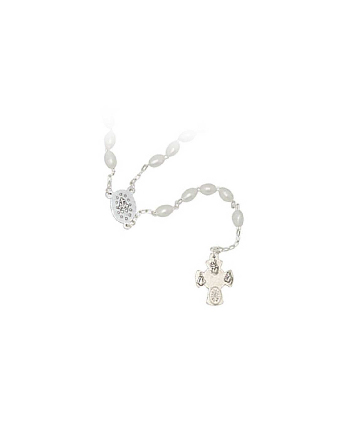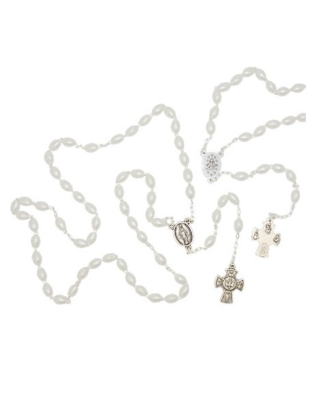 Chapelet en perles allongées blanches nacrées avec le cœur de la Vierge Miraculeuse et jolie croix avec différents Saints . Sacre cœur de Marie , Miraculeuse , St Christophe , Sacre Cœur de Jésus , St Joseph , St Antoine , Petit Jésus de Prague , Scapulaire , médaille rue du Bac et le St Esprit .