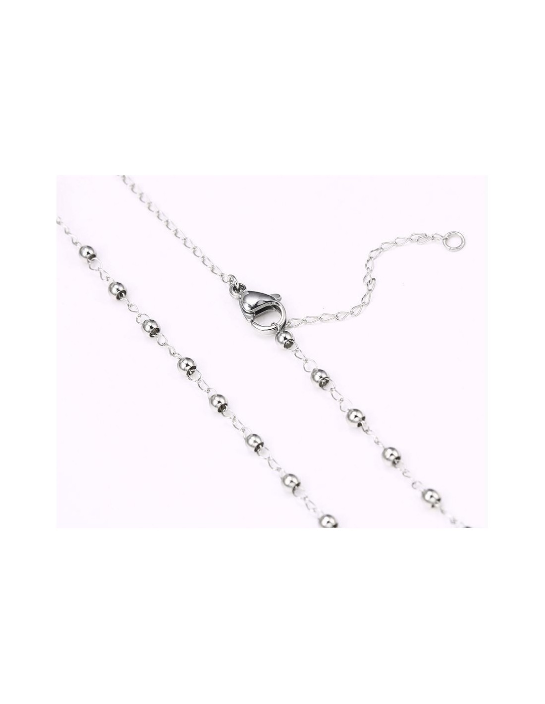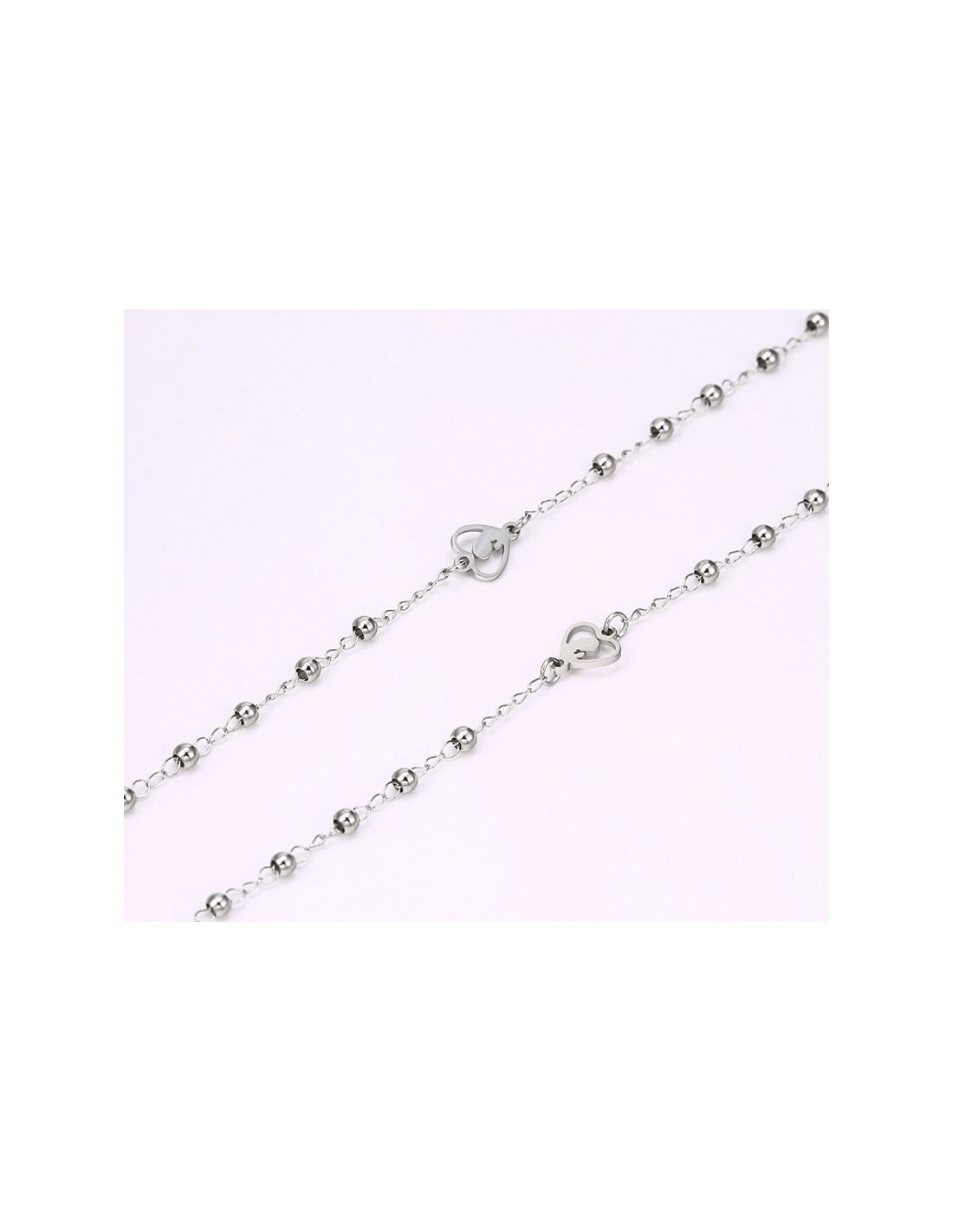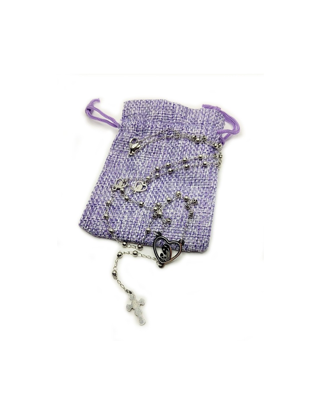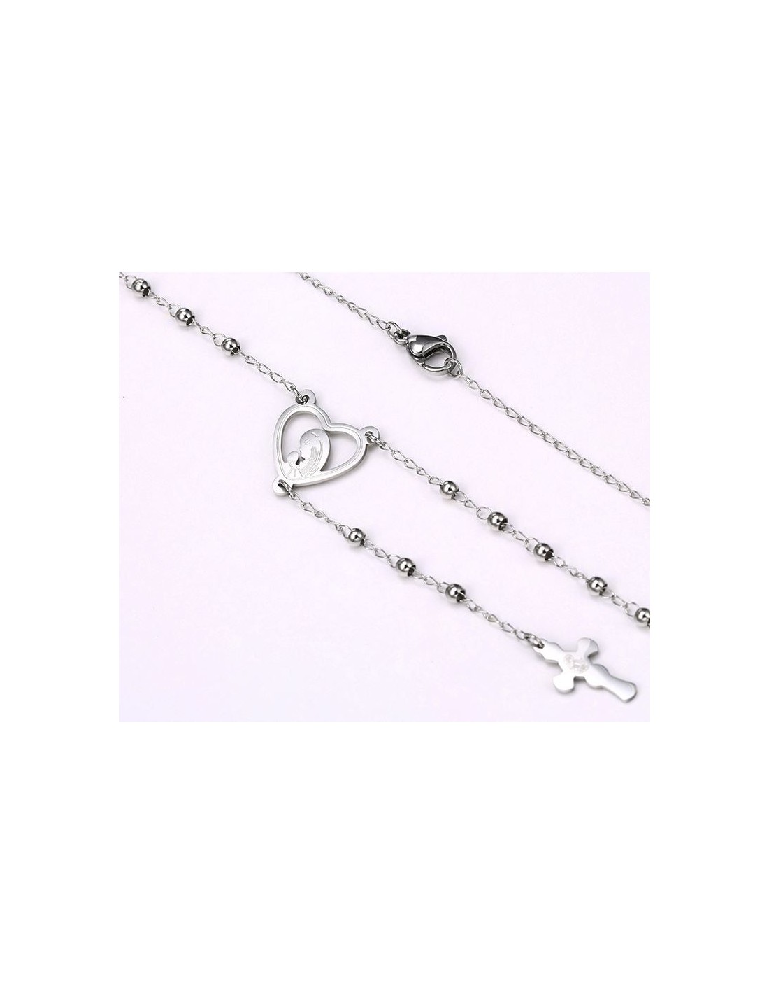Chapelet pouvant aussi servir de collier de 56 cm de long. Les perles spéciales sont des petits cœurs argentés et la pièce centrale une Sainte Marie en train de prier.