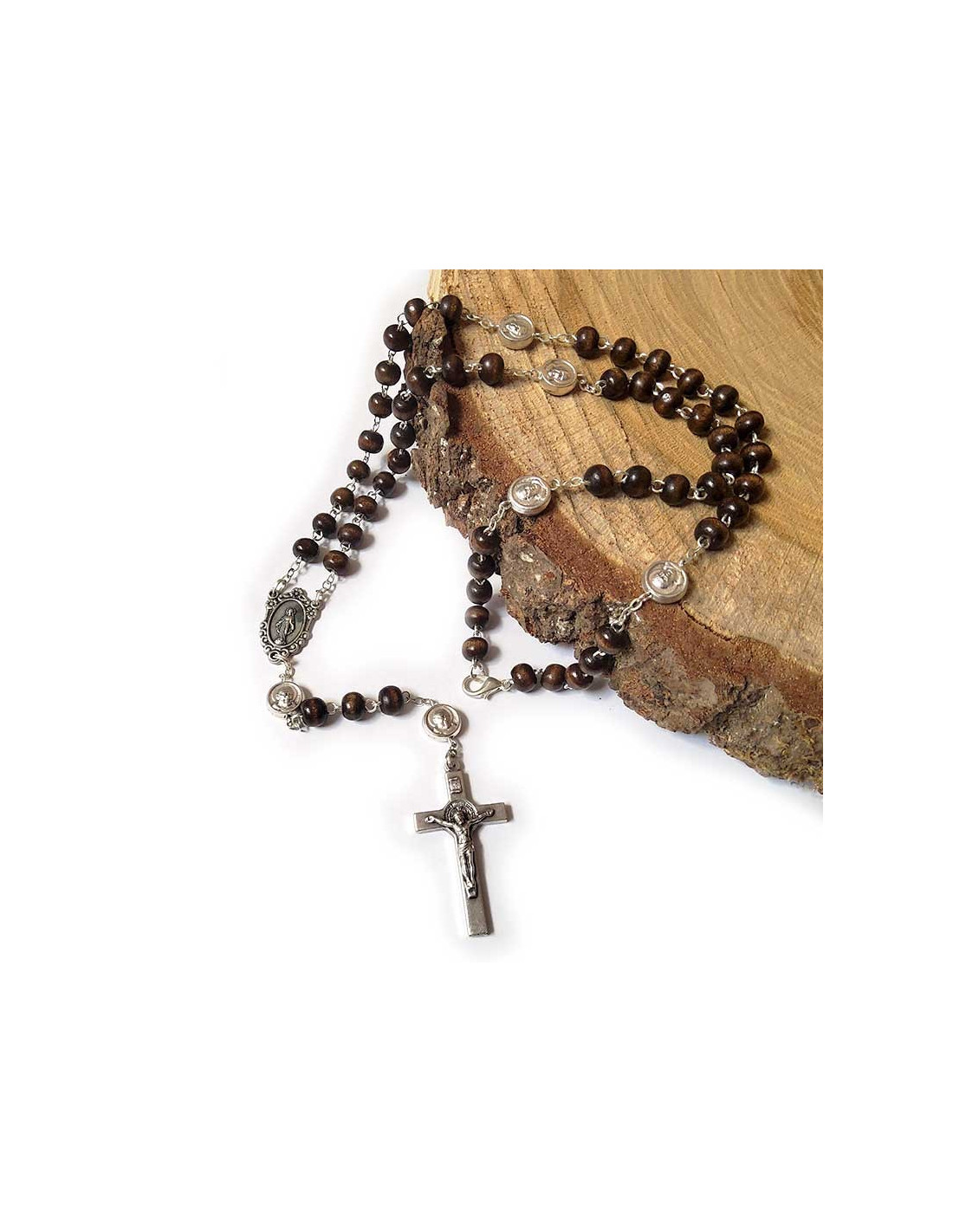 Chapelet en bois brun avec chaîne en métal argenté. Certaines perles ainsi que la médaille et le pendentif sont également en métal. La médaille est à l'image de la Vierge Miraculeuse avec le symbole marial au dos. Le pendentif est une croix fine et sobre délicatement ciselée. Les perles métalliques sont à l'image de Padre Pio et de la Vierge à l'enfant. Le chapelet se ferme à l'aide d'un fermoir à mousqueton.