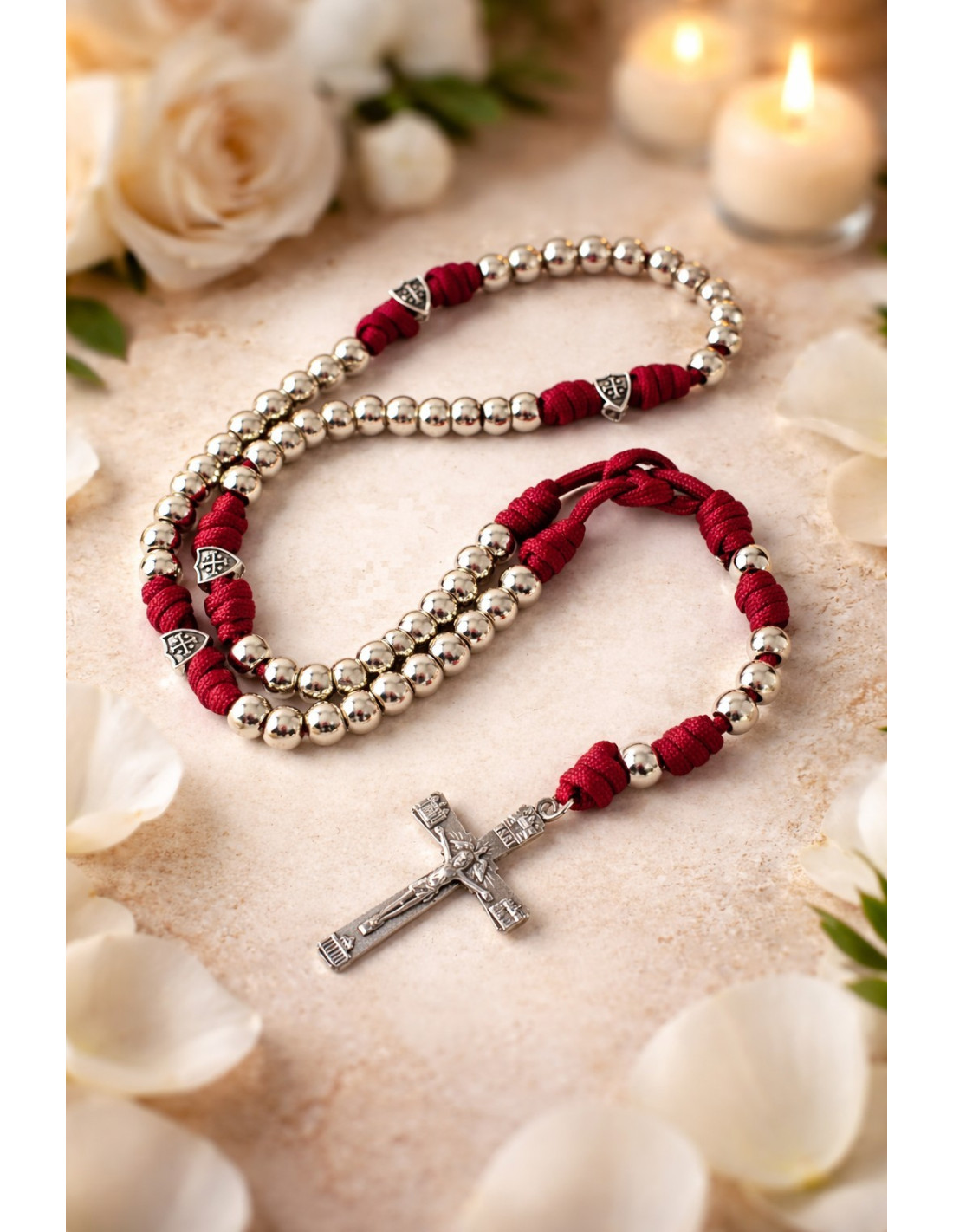 Chapelet en perles de métal sur corde bordeaux – Croix de Jérusalem (10 mm)
