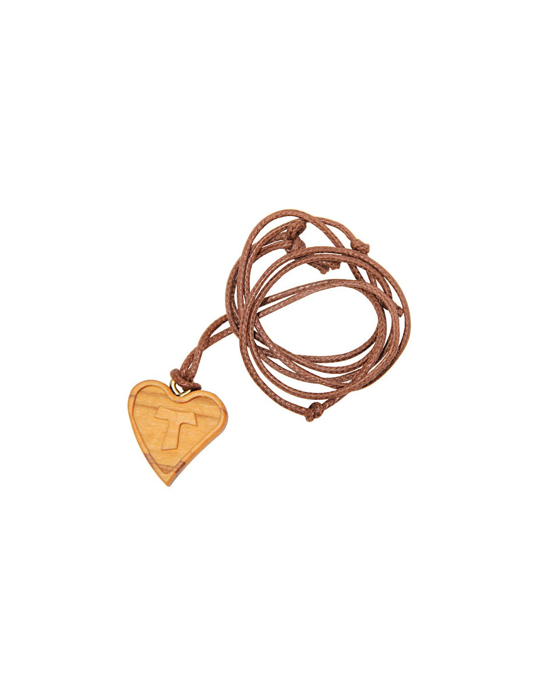 Collier en cordelette réglable afin de convenir aux enfants ou aux adultes. Le pendentif est en forme de cœur avec une croix de Tau en relief au centre, réalisé à la main en bois d'olivier.