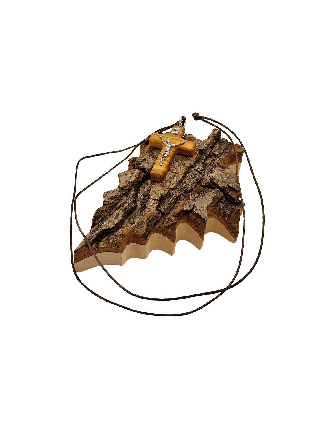 Un rappel éloquent au Gethsémani, le Mont des Oliviers où le Christ passa en prière sa dernière nuit avant la trahison. La croix est en bois d'olivier, une essence particulière et reconnaissable entre toute avec son grain fin et sa couleur claire. Le cordon est en cuir brun.