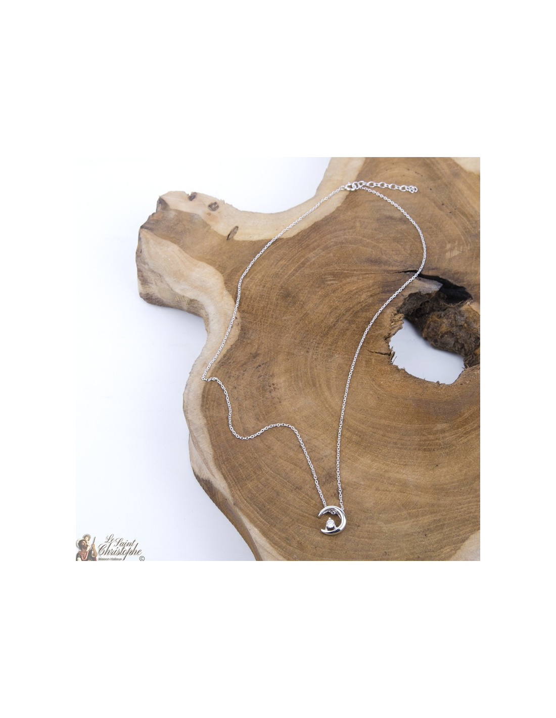Collier et pendentif en argent 925. Le pendentif est un croissant de lune et incrusté d'un cristal de zircon. La longueur de la chaîne est réglable.