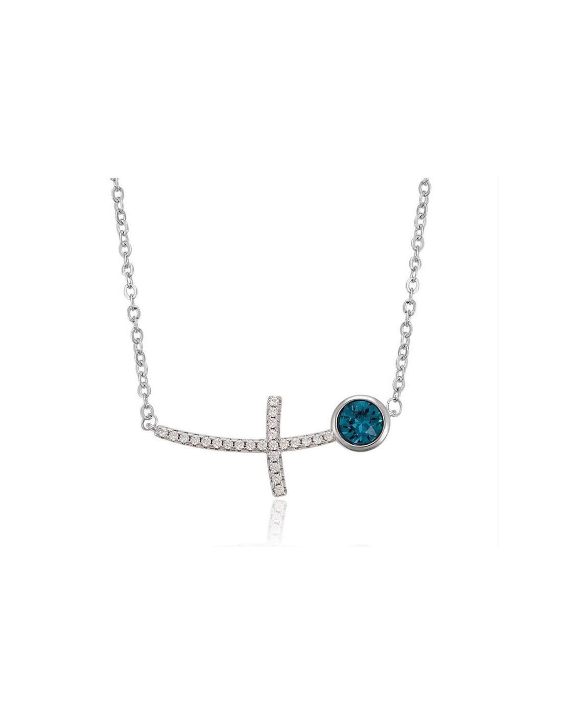 Collier et pendentif en rhodium et cristaux Swarovski. Le pendentif est une croix couchée et légèrement incurvée, incrustée de petit cristaux, surmontée d'un cristal bleu.