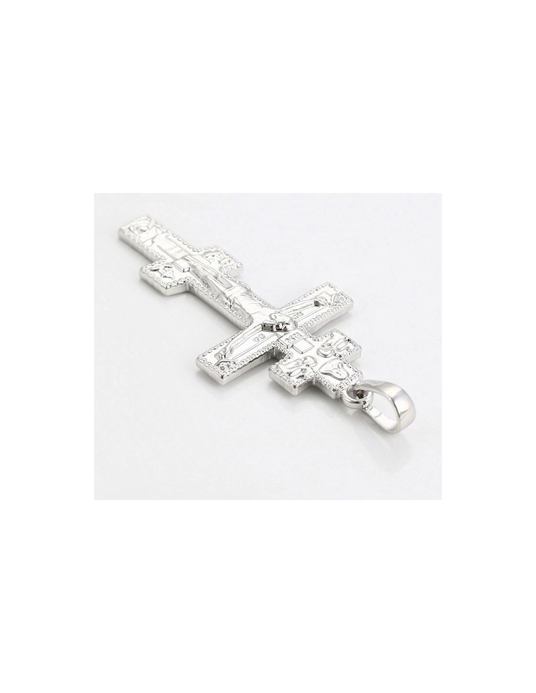 Pendentif en forme de croix orthodoxe, très finement sculptée de plusieurs figures, notamment celle du Christ crucifié avec un décor suggéré en fond, des anges et Marie au pied de la croix.