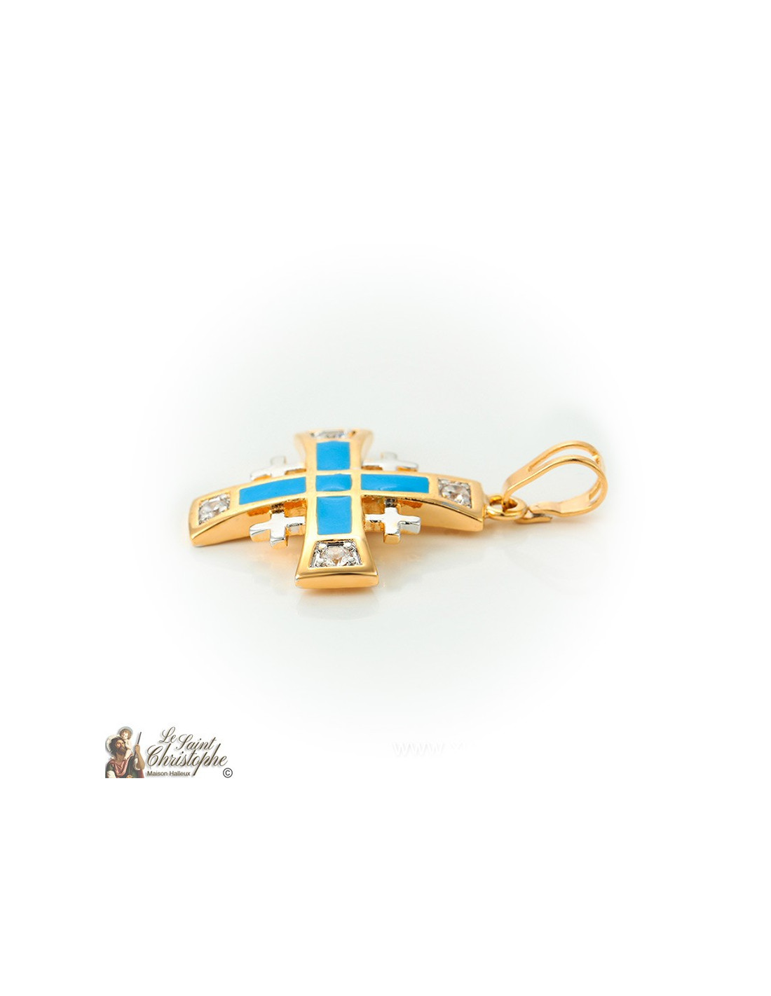 Pendentif en métal doré et argenté avec émaux bleus. La croix principale de cette croix de Jérusalem du pendentif est délicatement décorée par les émaux bleus, mettant en valeur et en contraste les cristaux présents aux extrémités. Les petites croix cernant la croix principale sont argentées et s'accordent parfaitement avec les cristaux.