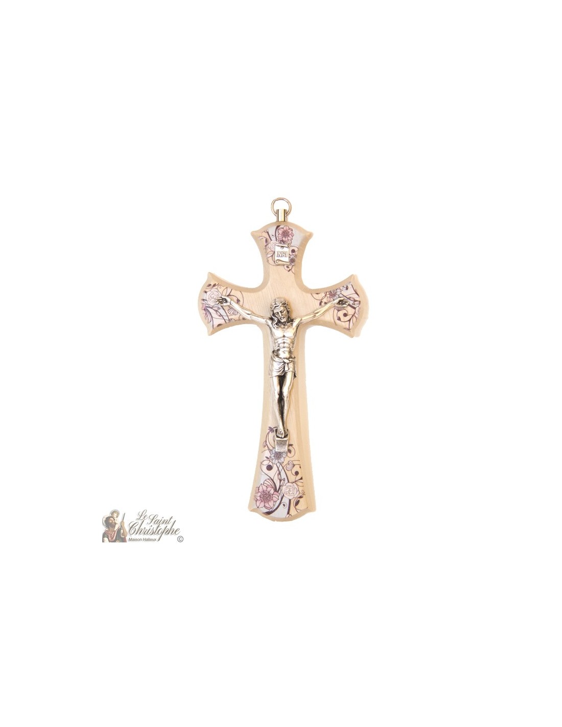 Croix murale en bois naturel clair avec de belles arabesques florales  et la figure de Jésus Christ en métal argenté. Les motifs floraux sont légèrement teintés de rose.