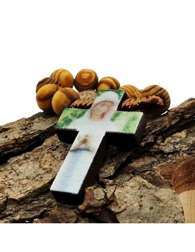 Dizaine en bois d'olivier. La croix du Christ est en bois brun avec la figure de Jésus peinte en doré et le portrait de N.D. des Pauvres de Banneux au dos. Ce dizainier est un petit format de poche, pratique pour le prendre partout avec soi.