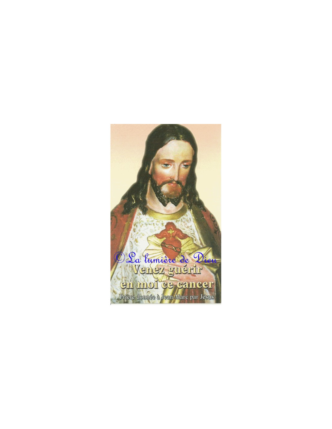 Image du Sacré-Cœur avec la prière "Venez guérir en moi ce cancer" donnée par Jésus à Jean-Marc, le 27 mai 2000, ainsi que la prière à saint Pérégrin, invoqué pour la guérison des maladies de longue durée, du cancer, du sida, des maladies contagieuses, des maladies vénériennes, tumeurs, ulcères et pour avoir un accouchement heureux.