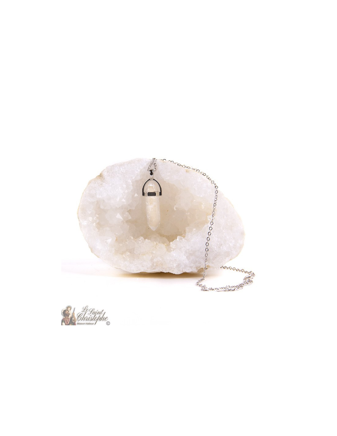 Collier en métal argenté avec pendentif en pierre fine, du cristal de roche.