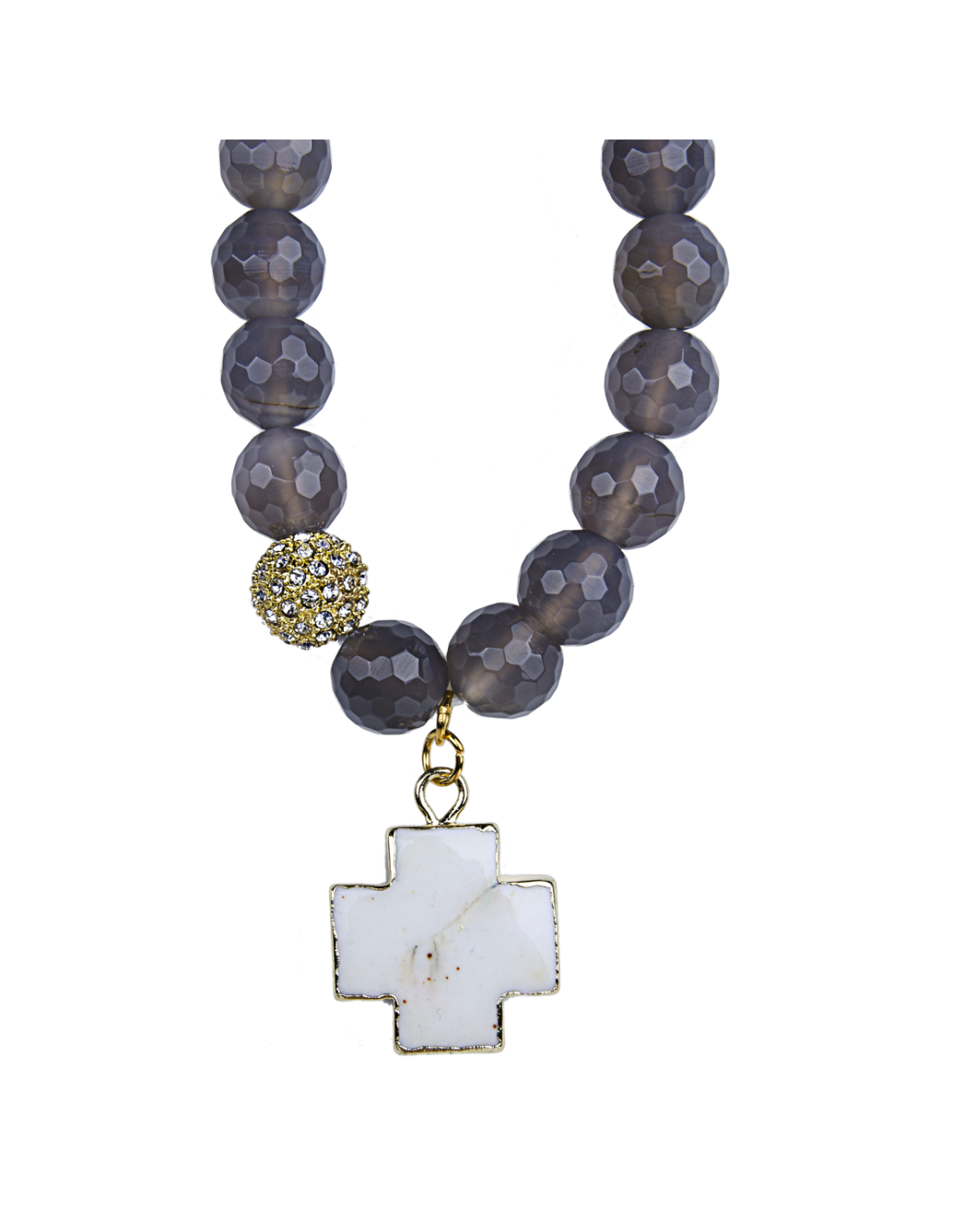 Bracelet en pierres fines d'agate grise et facettée et de turquoise blanche aux teintes tendres de brun, d'or et crème. Le charm en croix est plaqué or sur le contour, c'est pour nous le petit détail qui fait tout. Entre les agates se niche une perle dorée recouvertes de petits cristaux blancs. Idéal avec une tenue boho blanche ou avec des couleurs pastels, ce bijou chic apporte une petite dose de magie à la personne qui le porte.