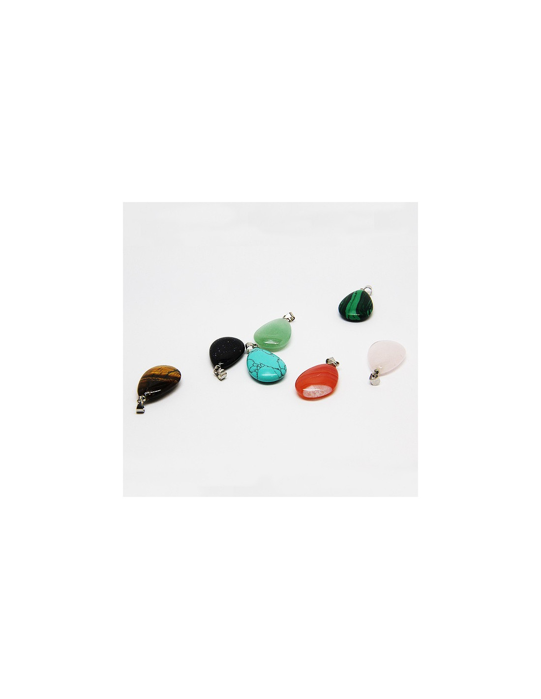 Ce collier est fourni avec 7 pendentifs en forme de petites gouttes. Les sept pierres sont de la cornaline, de la gold stone, de l’œil de tigre, de la malachite synthétique, de l'aventurine verte, de la turquoise reconstituée et de la purple stone.